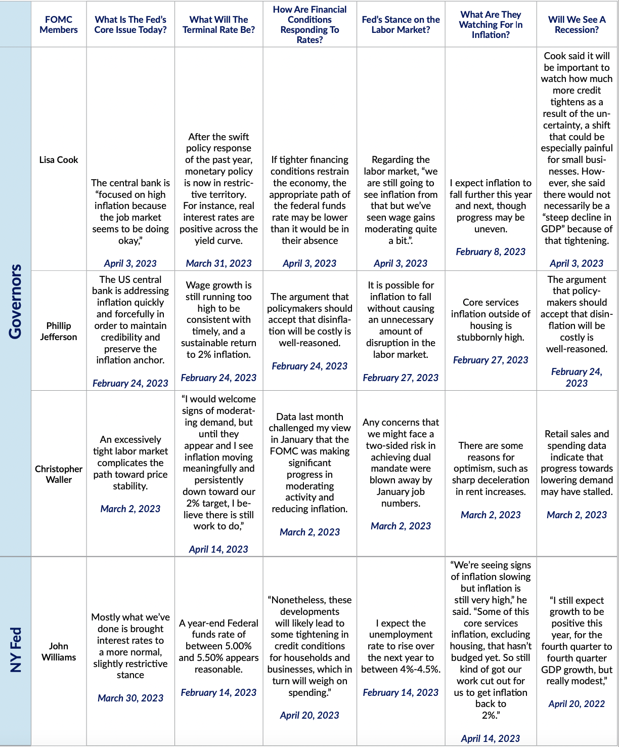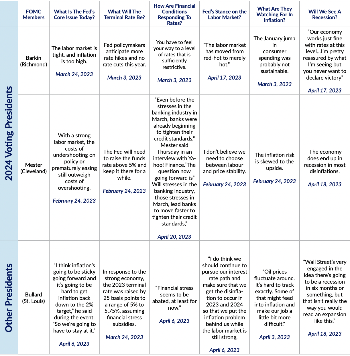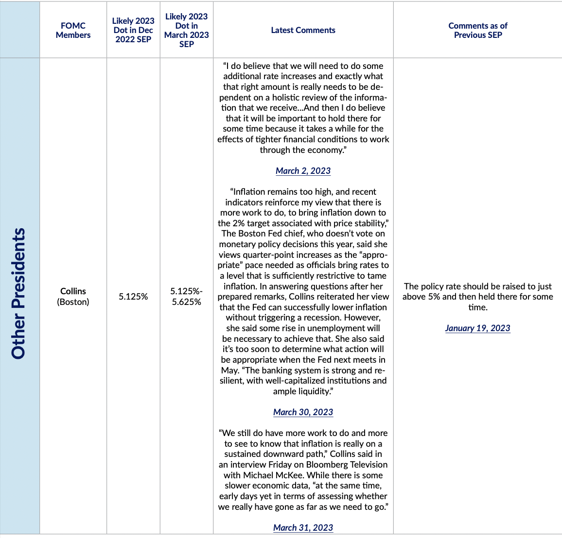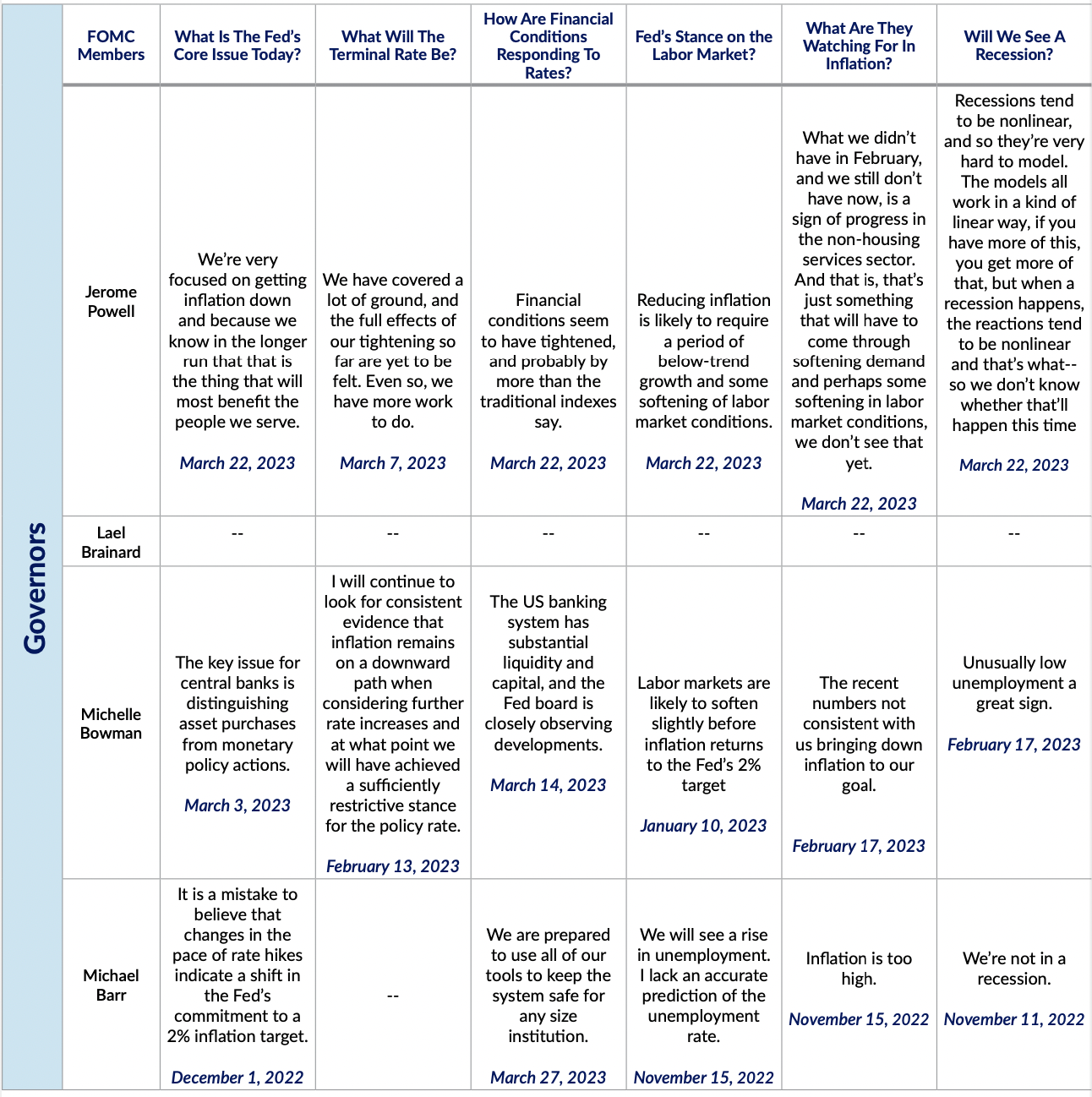- Not out of the woods on bank credit tightening by any stretch: The Fed staff that support monetary policy decisions are not bank analysts. They, along with FOMC members, tend to only see these dynamics from a top-down perspective...recognizing risks only after they are publicly obvious. If you keep getting blindsided by banking challenges, the rational response is to proceed with greater caution. Former regional Fed presidents Eric Rosengren and Robert Kaplan have publicly reflected that sentiment more vocally in recent weeks. Fedspeak suggests that for many non-academic-macroeconomist FOMC members, the inclination to tread lightly and stop hiking after May is strong. For these members, they are most keen to avoid getting mugged by banking dislocations. Given the attenuated nature through which financial system transmits the Fed's policies to the real economy, they probably will keep being caught offsides. Claims that the Fed can manage financial stability independent of monetary policy decisions will keep coming sporadically under pressure.
