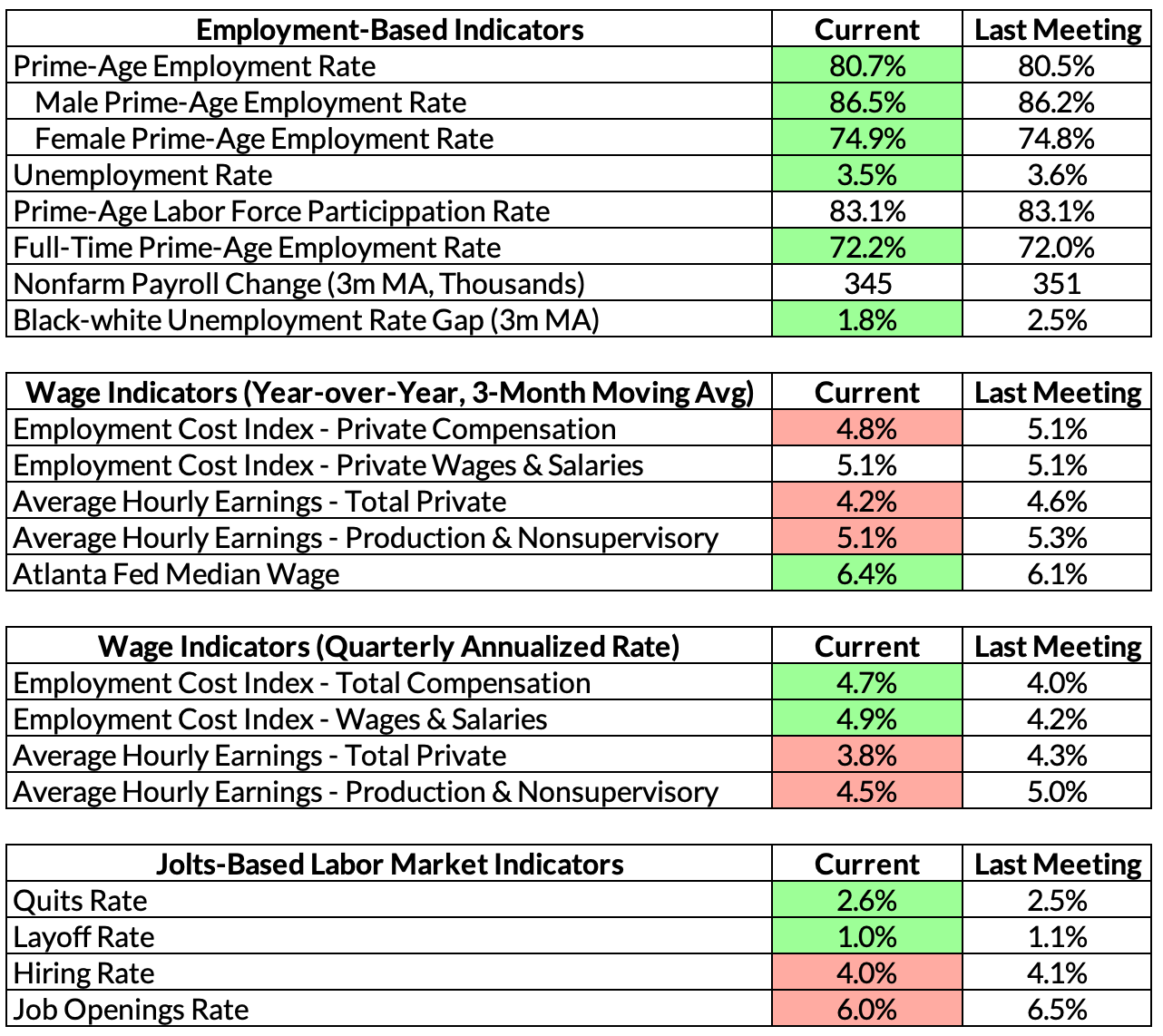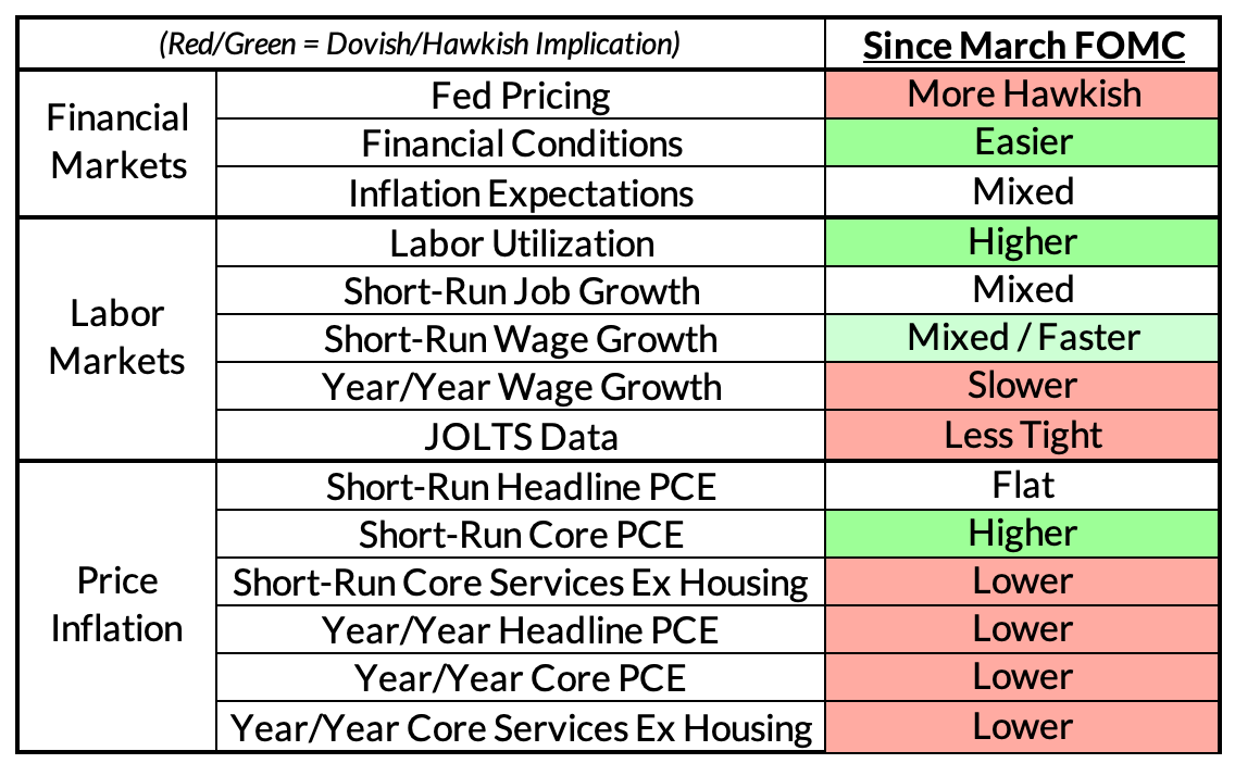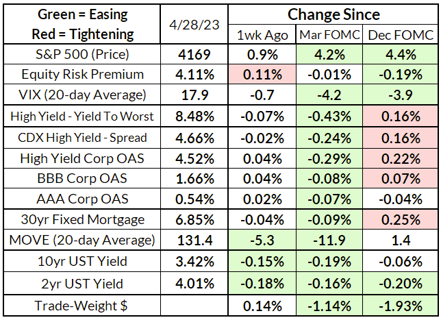 - Discomfort with inflation and labor market strength. The Fed is likely to be unsatisfied with the pace of progress on inflation thus far, and Friday's ECI release hindered the opportunity to at least walk back some of their more hyperbolic claims about an overheated labor market. Given that capital market conditions have marginally eased since the last FOMC meeting, the Fed would normally continue to posture hawkishly. And given that the Fed sees recessionary conditions as consistent with appropriate policy, the Fed staff and FOMC are likely displeased by the signs of growth resilience in the Q1 GDP and employment data.
