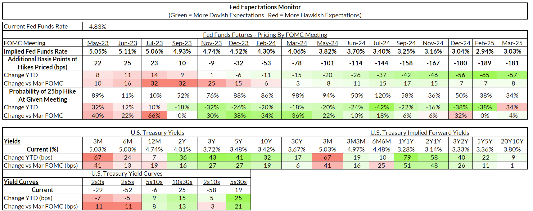 - 25 basis point hike. Market pricing currently implies an 88% chance of a 25 basis point hike at the May FOMC meeting. Barring spillover fallout from First Republic's failure prior to the FOMC meeting, the Fed will hike another 25 basis points this Wednesday.