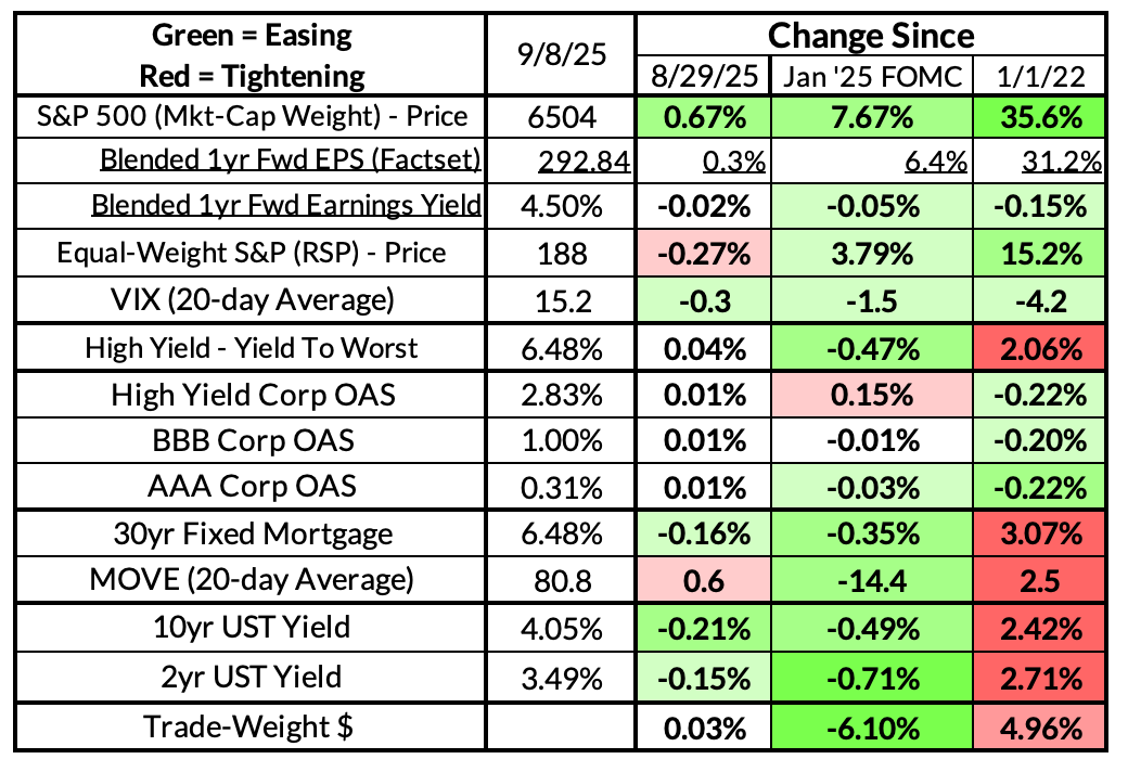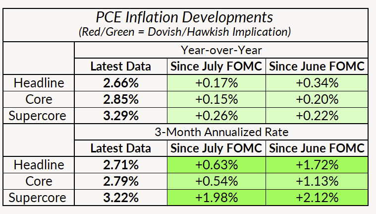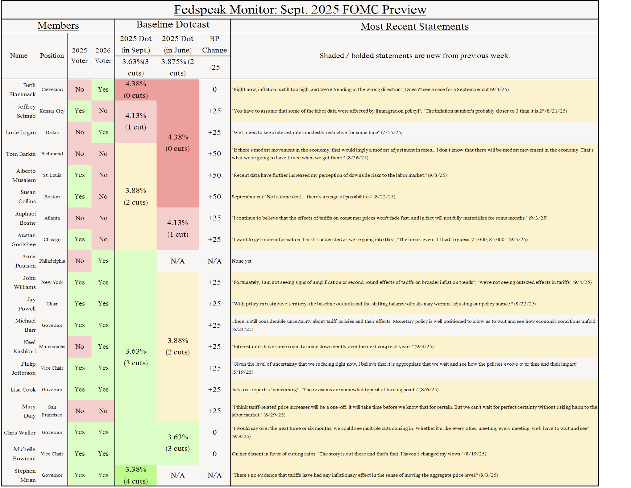 Meanwhile, PCE inflation hasn’t come in too hot. While CPI came in hot in August, the relevant components for PCE were cool; we are now tracking a 16bp reading in core PCE for August and 2.85% year-on-year (the last SEP had core PCE at 3.1% for the year). Ever since Powell’s Jackson Hole speech, the inflation data is less high-leverage now that the bulk of the Committee seems willing to adopt Waller’s stance of looking through tariff inflation.