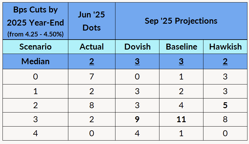 What remains to be seen is how much they will signal about the remainder of 2025. We have almost no Fedspeak since the August jobs report, just one interview with Goolsbee who even then was not committed to a September cut. There’s a lot of uncertainty about exactly how worried the Committee is, and we expect there to be a wide range of views. In our hawkish scenario, the core hawks (Hammack, Logan and Schmid) are undeterred by the labor market data; the modal member pencils in three cuts but the median remains at two.