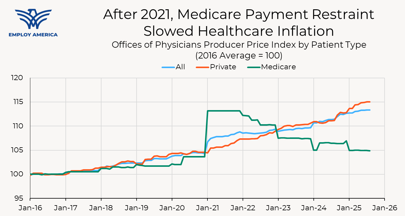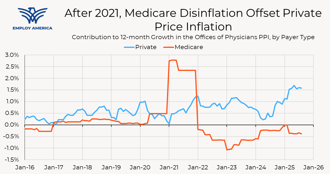 Changes to Medicare payment rates, therefore, have an indirect effect on inflation by changing private prices. This indirect effect is harder to see in the PPI (and therefore PCE) data because the changes to private prices happen over time, but the magnitude of the indirect effect likely dwarfs the direct effect. Although Medicare is the largest single purchaser of healthcare services, the overall size of the private market is larger. Medicare pricing acts as a fulcrum that policymakers can use to influence pricing in the broader healthcare market.