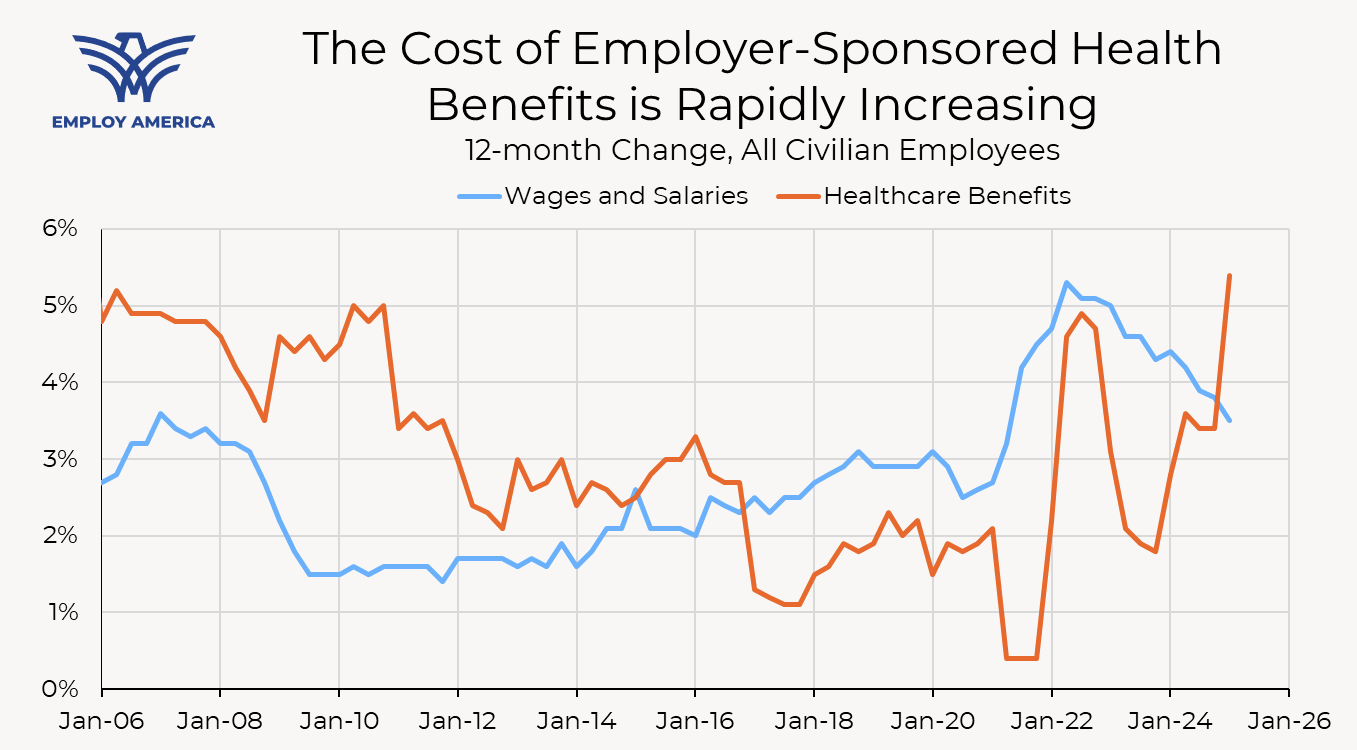 Healthcare also plays a special role in the labor market. Nearly 75% of workers aged 18 to 64 receive health insurance benefits from their employer, and almost another 15% are covered as a dependent under someone else’s employer. This results in an effective “head tax” on employment that depresses wages and employment. As of March 2025, health insurance benefits accounted for 7.7% of the total cost of compensation for civilian employees.
