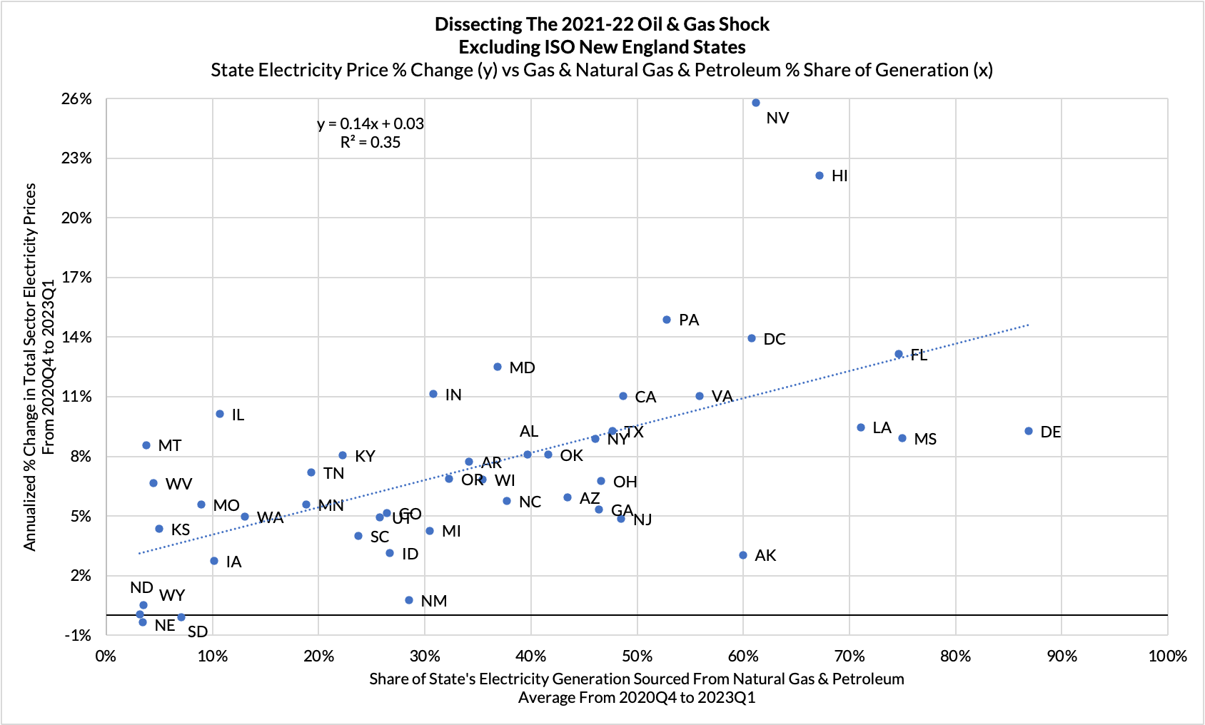 Excluding the states within the ISO NE (New England Independent System Operator), the variation in the share of each state's electricity generation sourced from natural gas and petroleum can explain a little over a third of the state-level variation in electricity price inflation over the critical 2021-22 period. For an additional 20% of total state electricity generation derived from oil and gas, electric bills were liable to increase by an additional 7% in a given year.