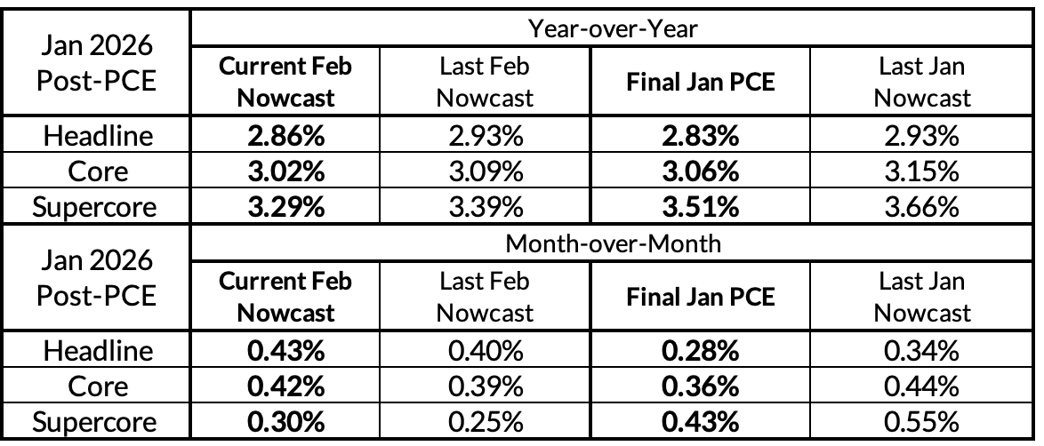 We pride ourselves on being among the closest in our forecasts / nowcasts of Core PCE, especially after receiving all of the relevant information from CPI, PPI, and import prices. January proved to be an uncharacteristic miss for us (8-9bps too high on Core PCE). We would be suspicious of those who nailed the final reading given what the Bureau of Economic Analysis (BEA) just engaged in, since there was no way to forecast the BEA's one-off methodology change for tracking legal service price changes. Inflation is still far too hot for the Fed's comfort, but it should have been hotter, had the BEA adhered to its standard practices for estimating PCE.