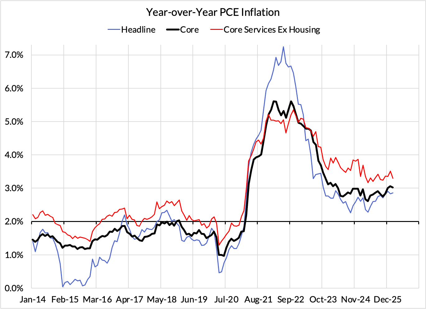 The February growth rate in "Core Services Ex Housing" ('Supercore') PCE is on track to run at a 3.29% year-over-year pace, a 71 basis point overshoot versus the ~2.59% run rate that coincided with ~2% Headline and Core PCE inflation.