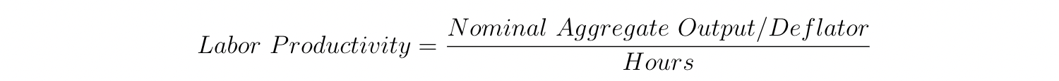 Labor Productivity is a ratio of real output to the same index of hours, where real output is nominal output from the GDP data, deflated by the value-added output price deflator for the sector.