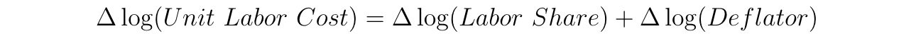 With that accounting in hand, we can show how the reality is the exact opposite of the “sensible intuition” above: mechanically, the changes in ULCs came from changes in the price deflator, which measures… inflation. We can decompose changes in unit labor costs into changes in the labor share and changes in the price deflator by taking log differences: