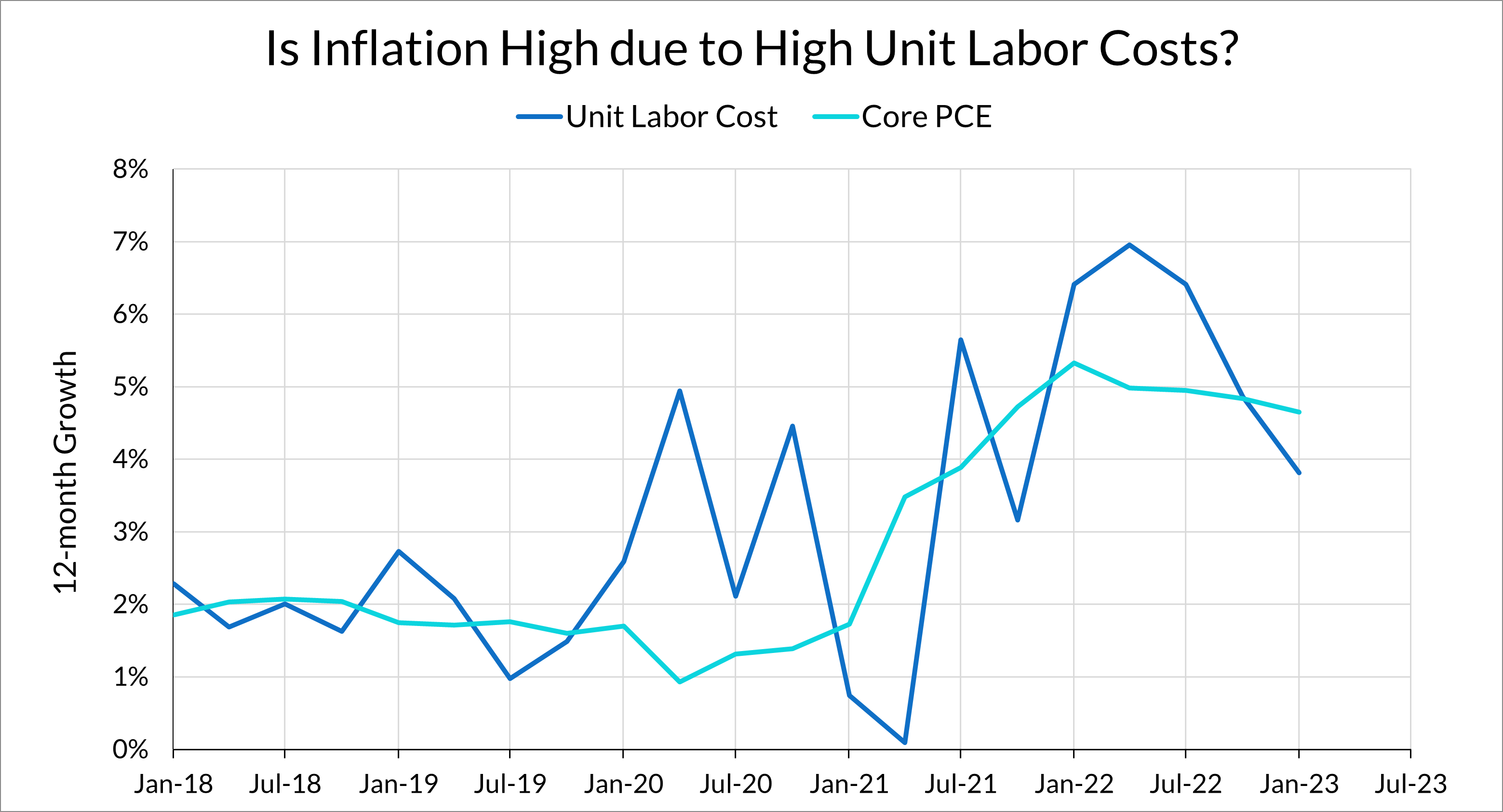 The increase in unit labor costs since 2020 is basically explained by the rapid increase in the price deflator. While there was a substantial increase in the labor share in 2020, the labor share has since fallen and is essentially back to 2019 levels.