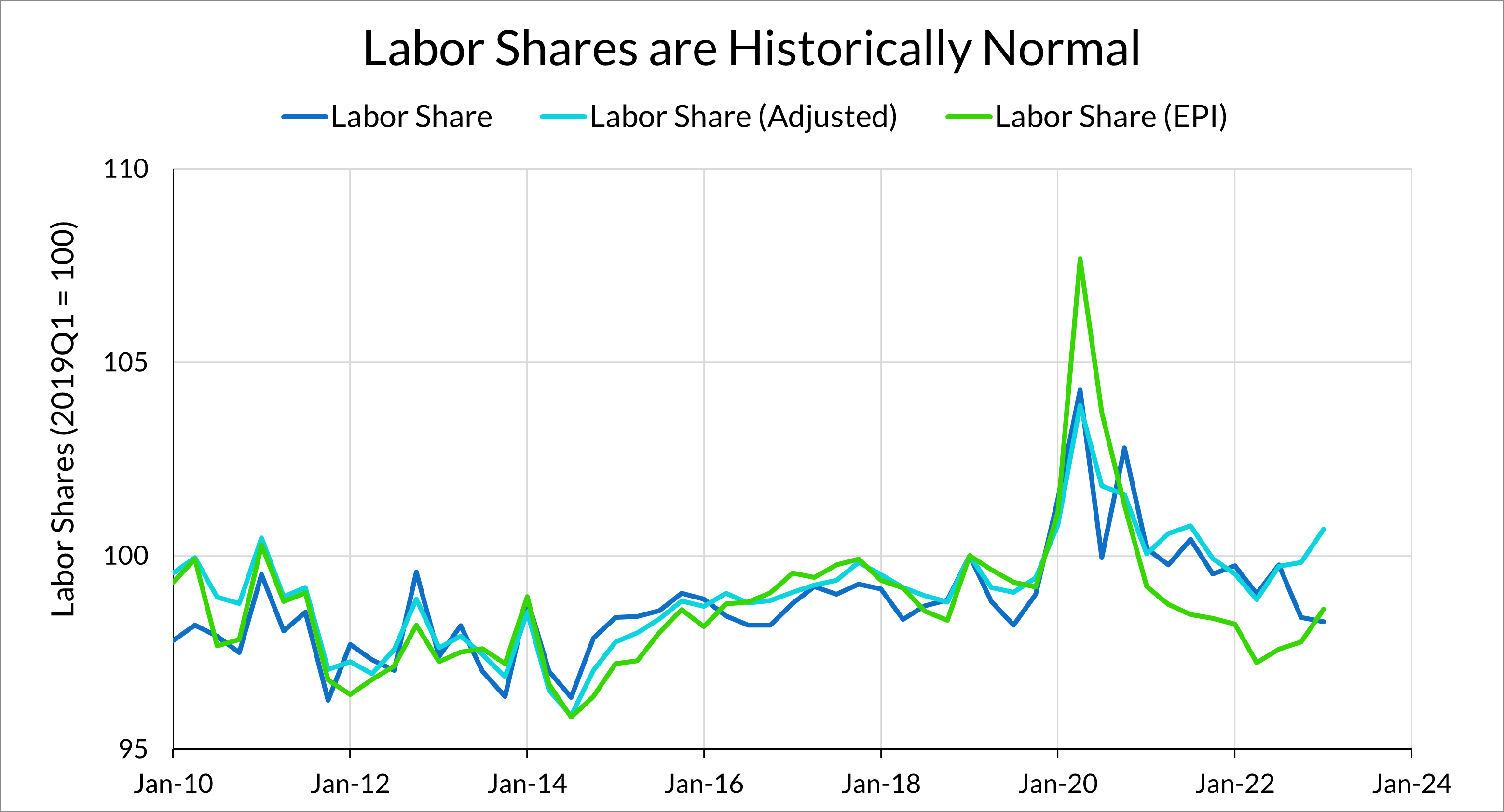 In historical context, it is hard to look at labor shares and conclude that compensation is too high relative to output. While labor shares did spike during the early part of the pandemic, labor shares have been decreasing ever since and are now around 2019 levels (the GDI-based measure has been increasing over the past two quarters due to divergences between GDI and GDP that may be spurious). Even if the labor share was increasing, it’s not clear that this would necessarily be inflationary; the historical norm after episodes of high price and wage growth is for nominal wage growth to outpace falling inflation, allowing real wages to catch up without triggering a wage-price spiral.