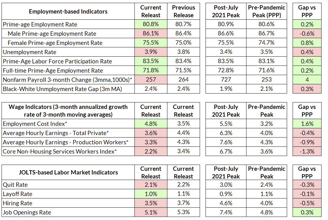 Despite the “miss” on the jobs number, this is still a very strong labor market. Both prime-age employment rates and labor force participation rates climbed. Prime-age employment rates have been rising over the past four months, and now just 0.1pp off their peak of 80.9% last year.