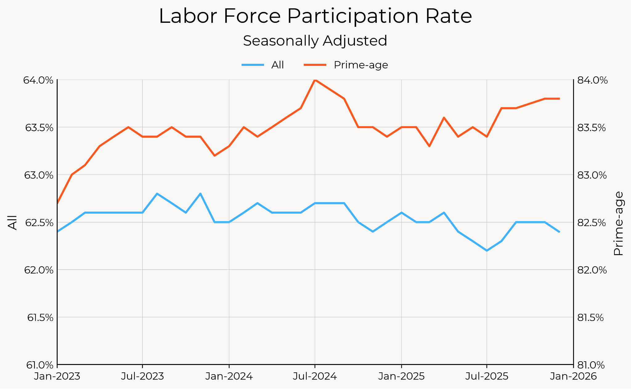 | Participation Rate (Prime-age) | 83.8% | 0.0% | +0.1% | +0.4% | +1.3% |