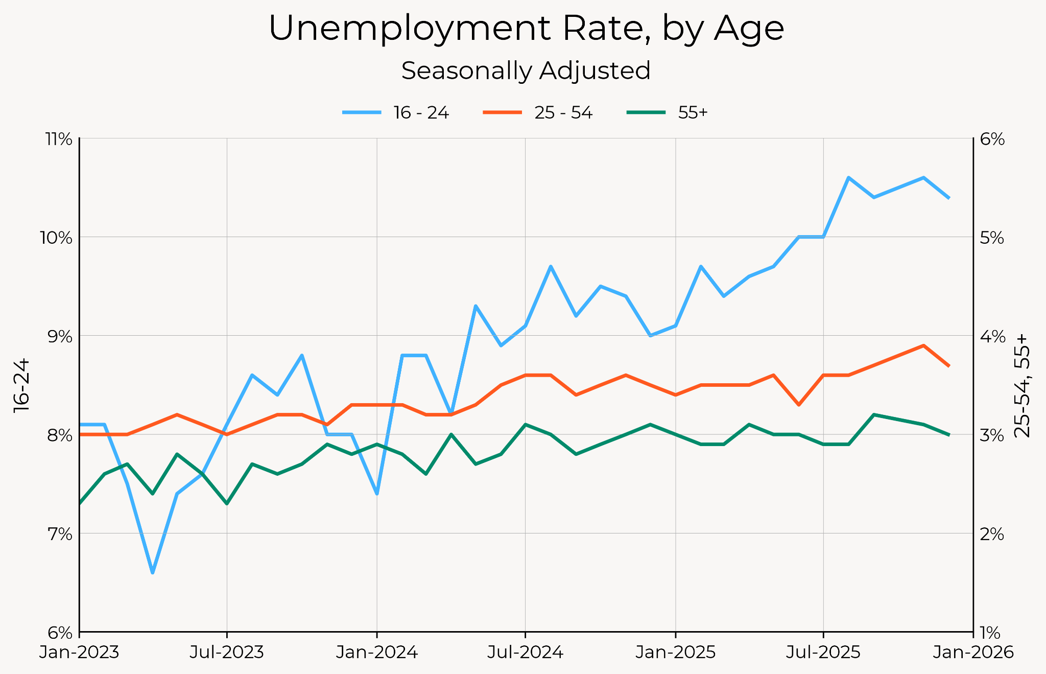 That increase in youth unemployment is large relative to other age groups, but it’s still not as sharp or large as the increase in youth unemployment rates during recent recessions. Meanwhile, the unemployment rate in prime-age workers and older workers has only increased marginally over the past twelve to eighteen months.