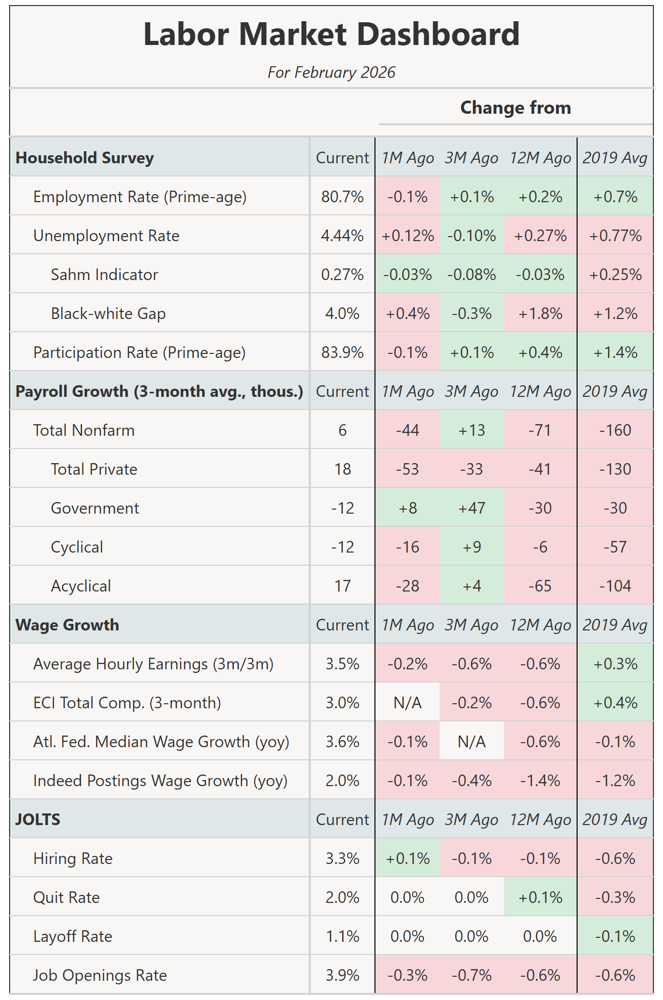 The new birth-death model adjusted jobs by -61k and +90k in January and February 2026, respectively. Those adjustments are far more favorable to January and far less favorable to February than in previous years. There were 52k fewer job losses in January 2026 from birth-death relative to the average of Jan '25 and '24, and 53.5k fewer job gains in February 2026 relative to the average of Feb '25 and '24.