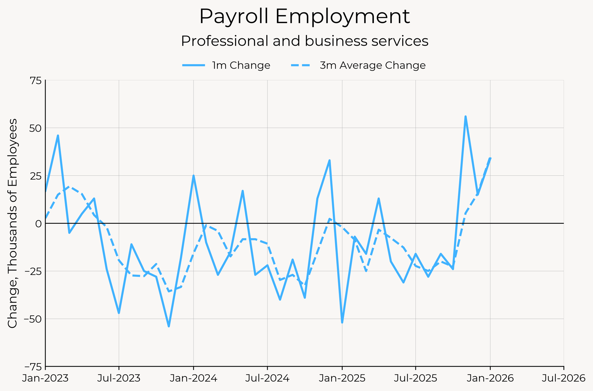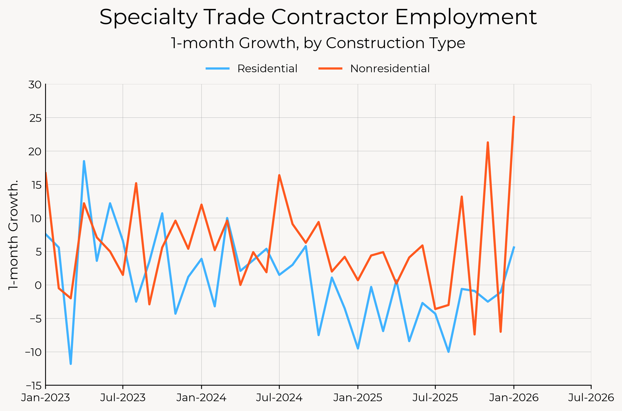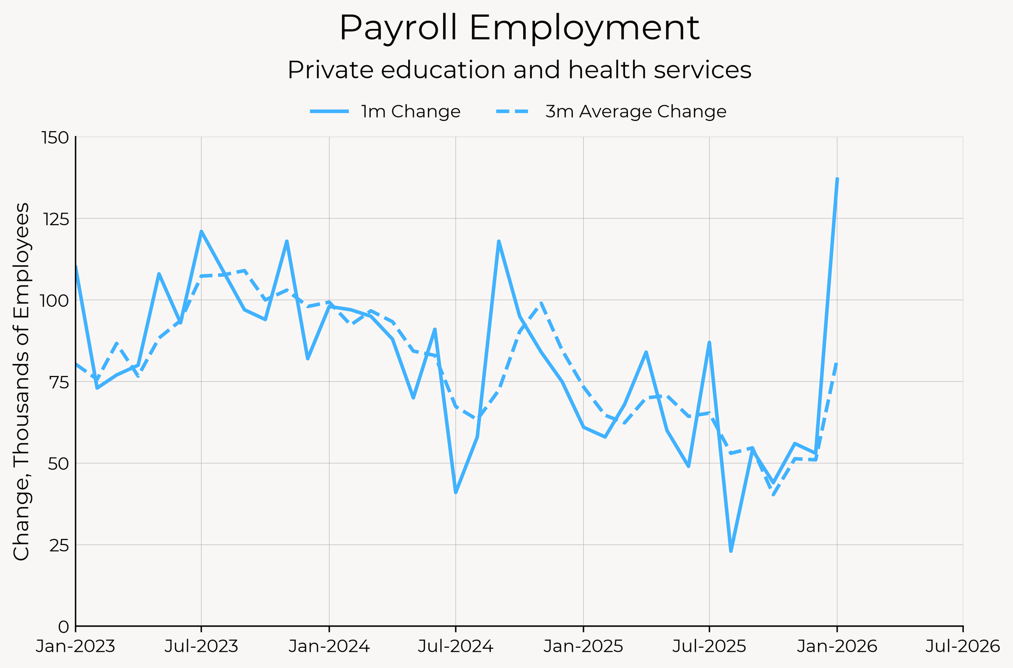 January 2026 saw strong payroll growth in construction, professional and business services, and education and health services. Construction jobs growth (which was concentrated in nonresidential specialty trade contractors) is surprising given the cold weather in January—the boom in AI investment is just too strong.