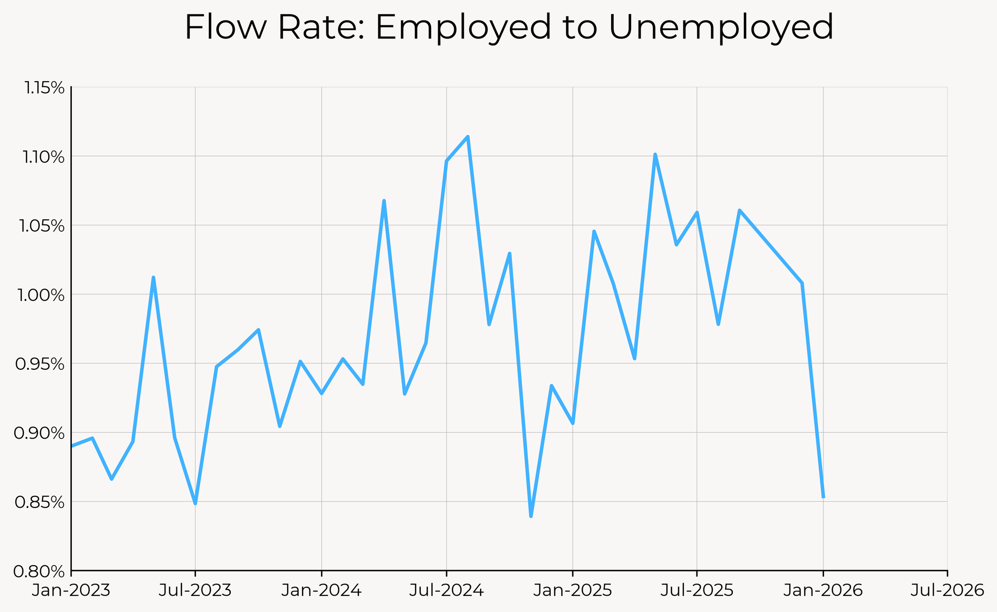 The second is a sharp decline in flows from employment to unemployment. Relatively few people lost their jobs last month (on a seasonally-adjusted basis). This month was low-hire, really low-fire.