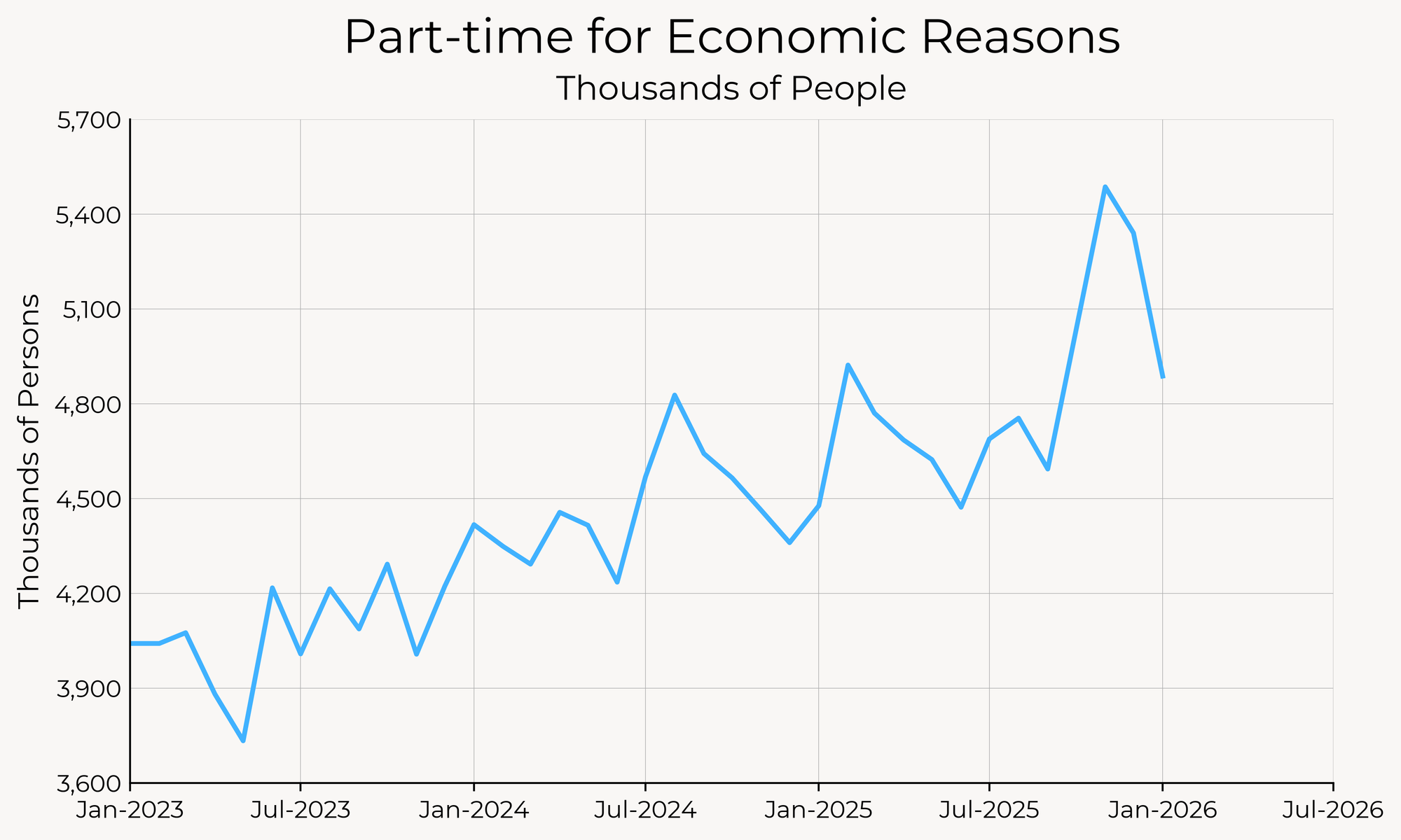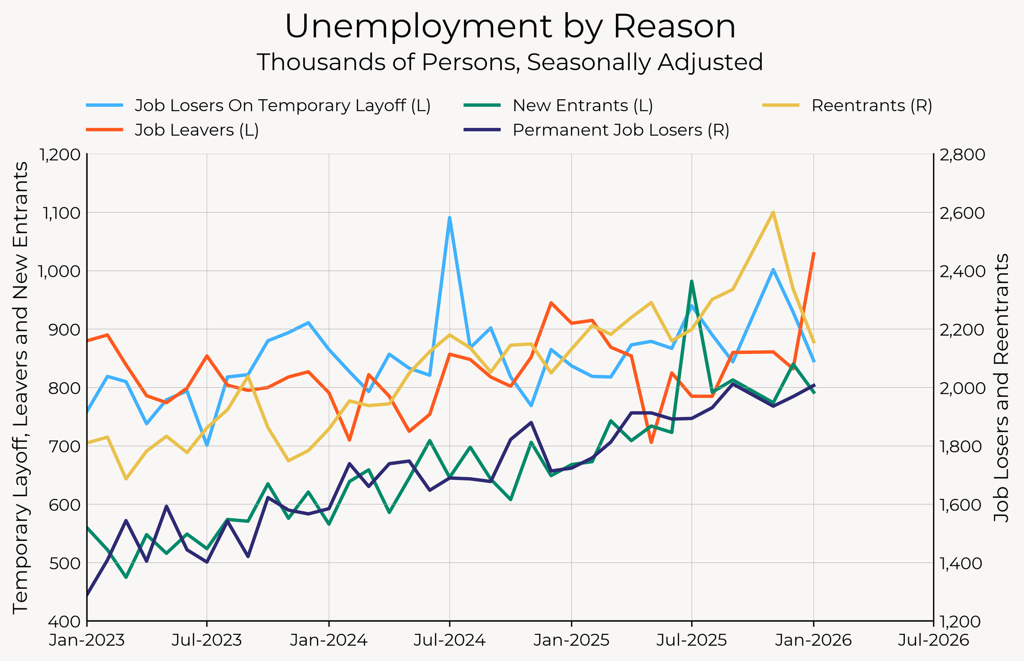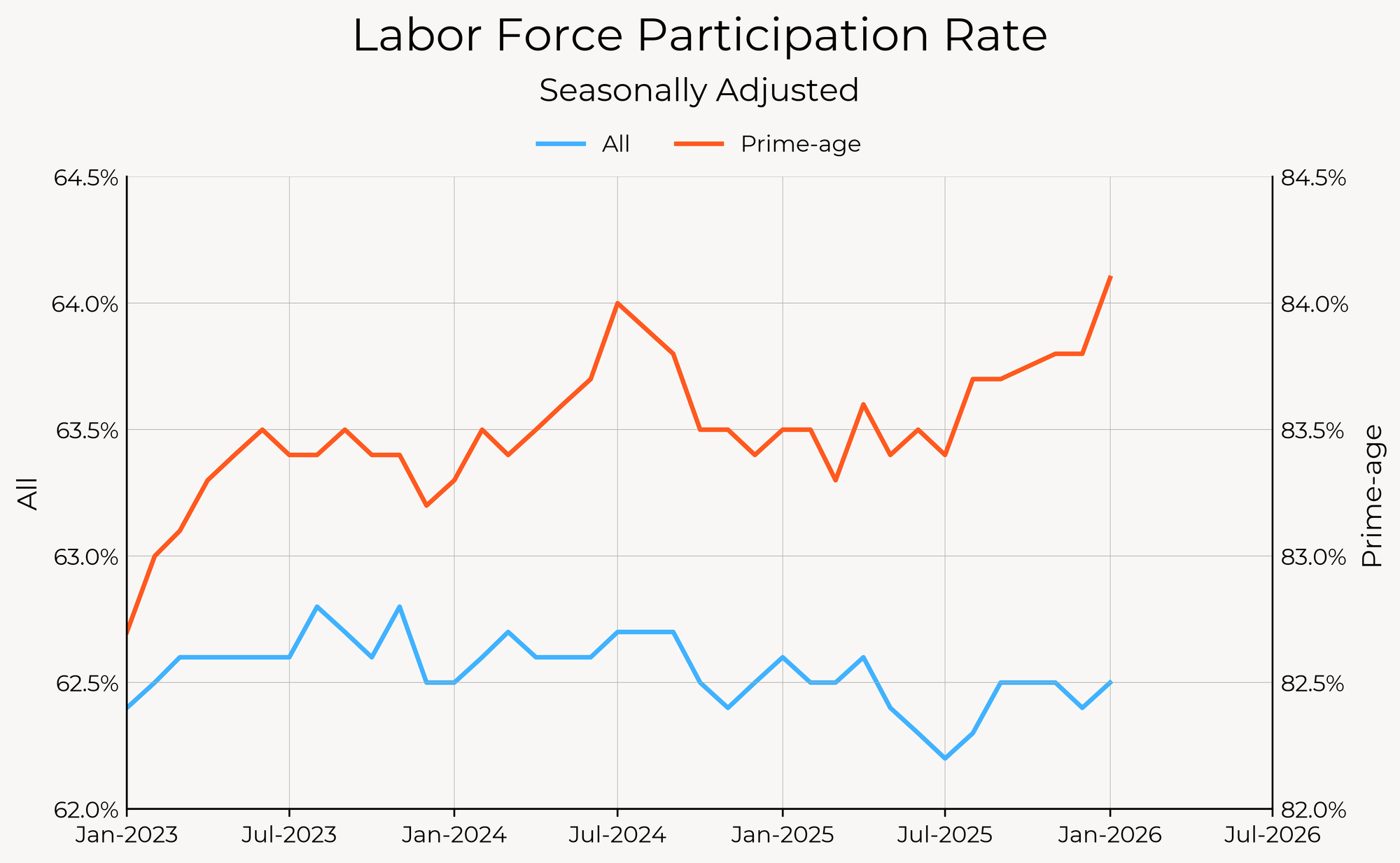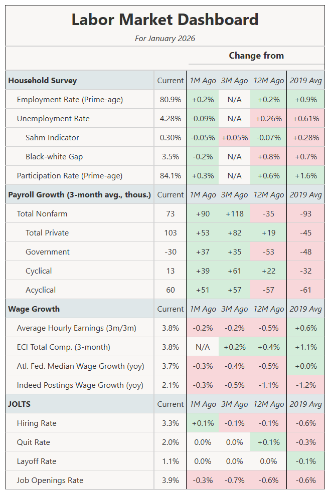 The “big news” in this report are the revisions to the past couple of years of payroll growth. Those revisions, which showed just 181,000 jobs added in 2025 (instead of 584,000) as previously reported) sound worrying, but don’t affect our assessment of the labor market that much. It was commonly known that large downwards revisions were coming (to anyone paying attention, anyways) and we always had the household survey, which is not subject to revisions, to refer to.