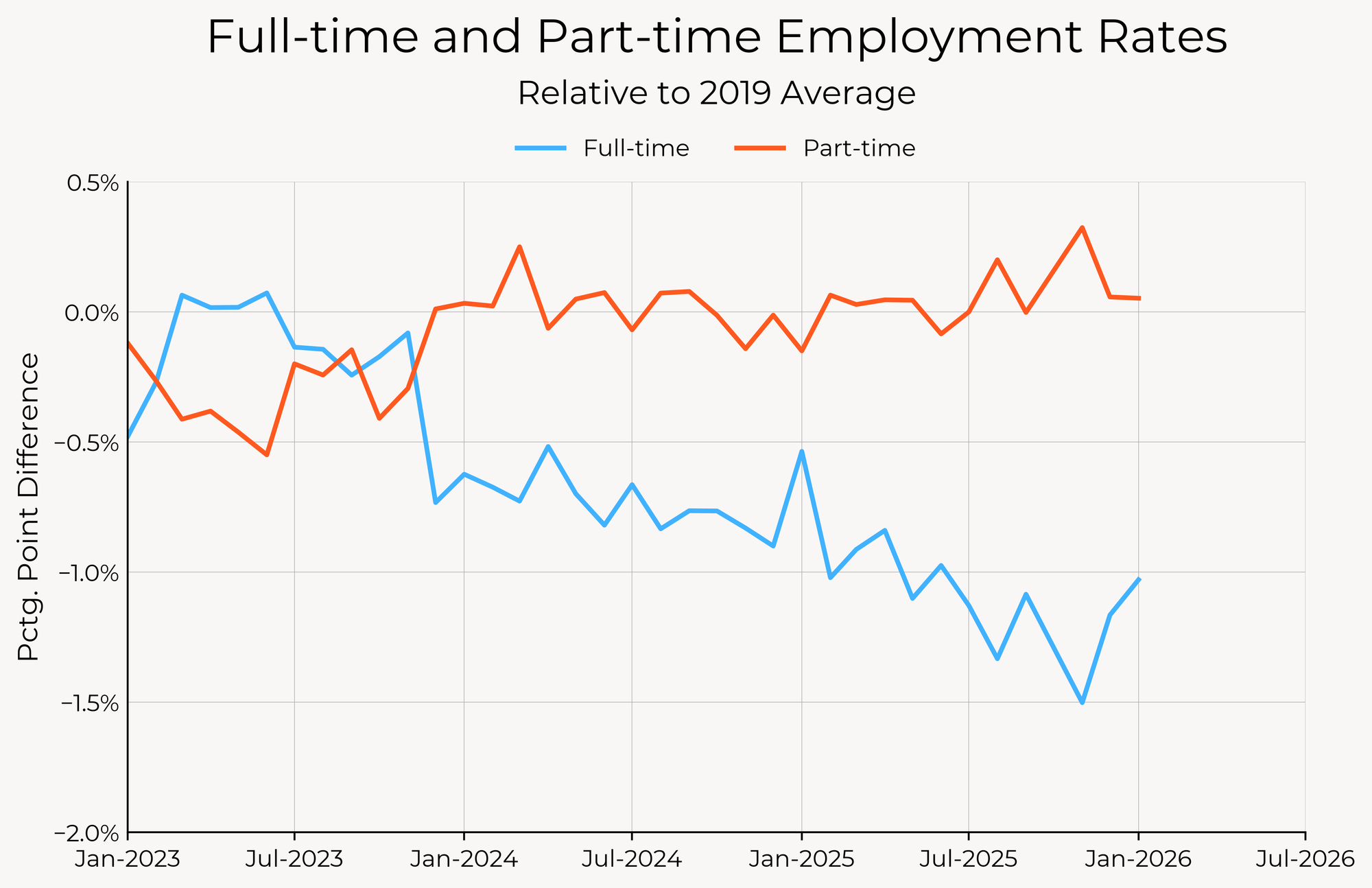 While full-time employment rates are still much weaker than pre-pandemic, the rebound in full-time employment over the past two months has undone the entire decline that occurred between February and November last year:
