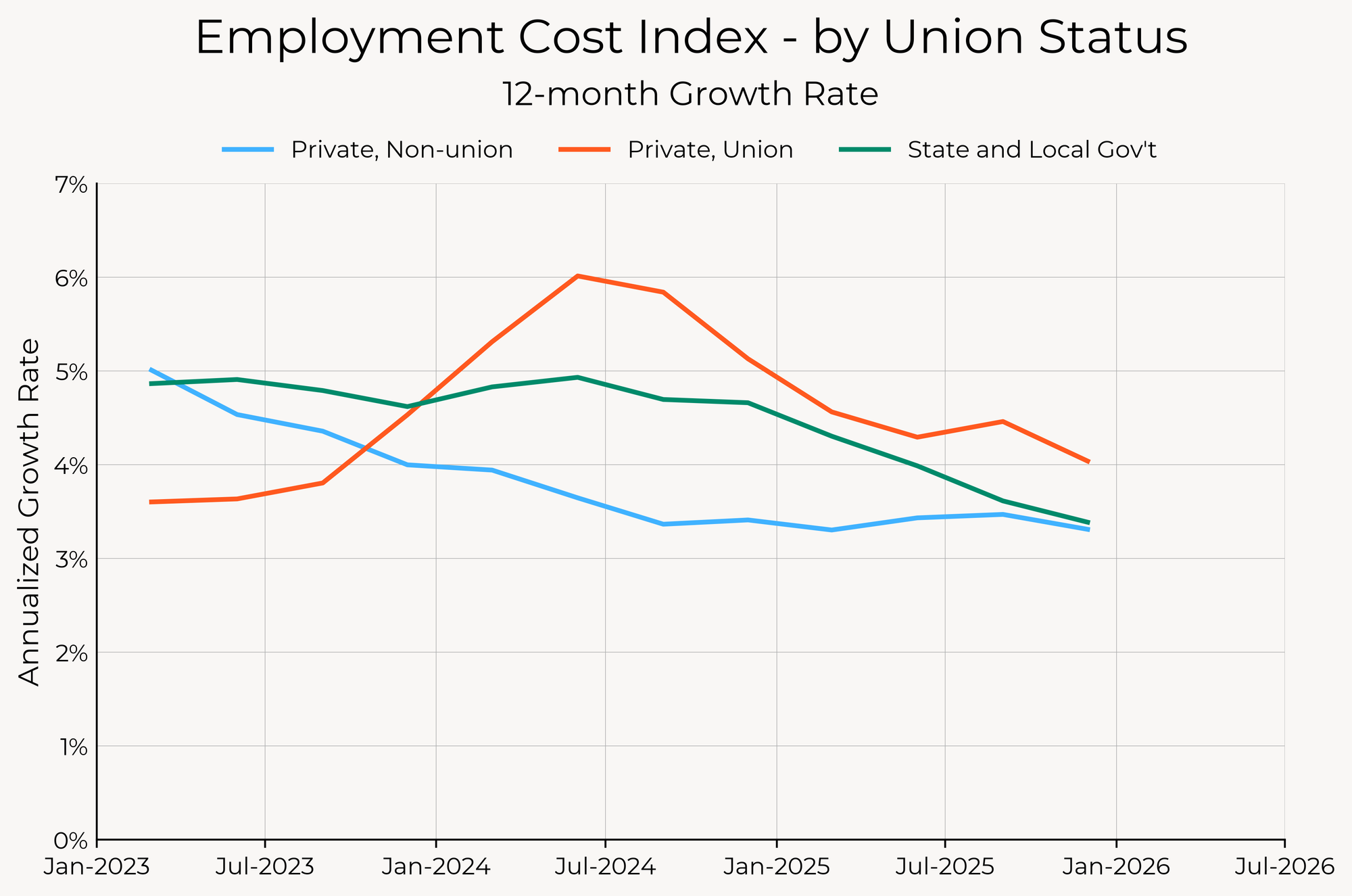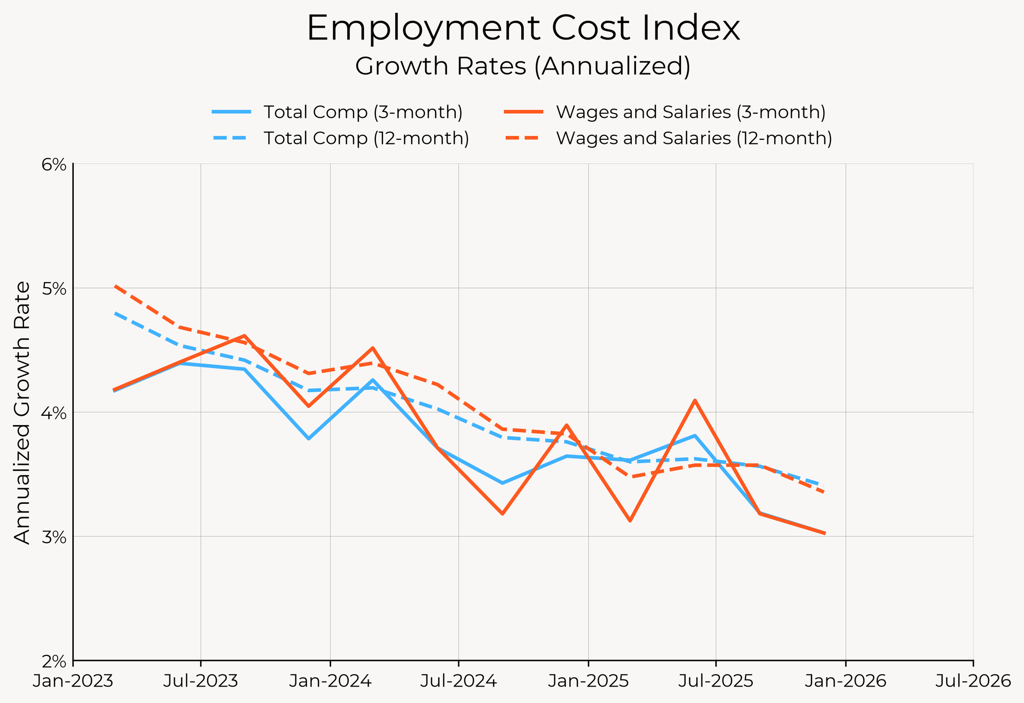 We got new data from the Employment Cost Index last month, which covers the fourth quarter of 2025. Compensation growth continued its gradual decline, with quarterly growth just barely clearing 3% last quarter.
