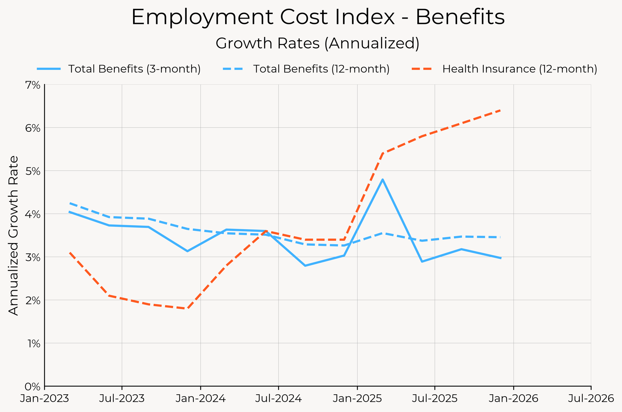 Somewhat worrying is the rise in health insurance costs. Health insurance benefits increased by over 6% in the past year, even while the cost growth of other wages and benefits has slowed. This doesn’t yet include any price increases in the coming year—premiums generally reset in January, and premiums for employer-sponsored insurance are expected to increase significantly in 2026.