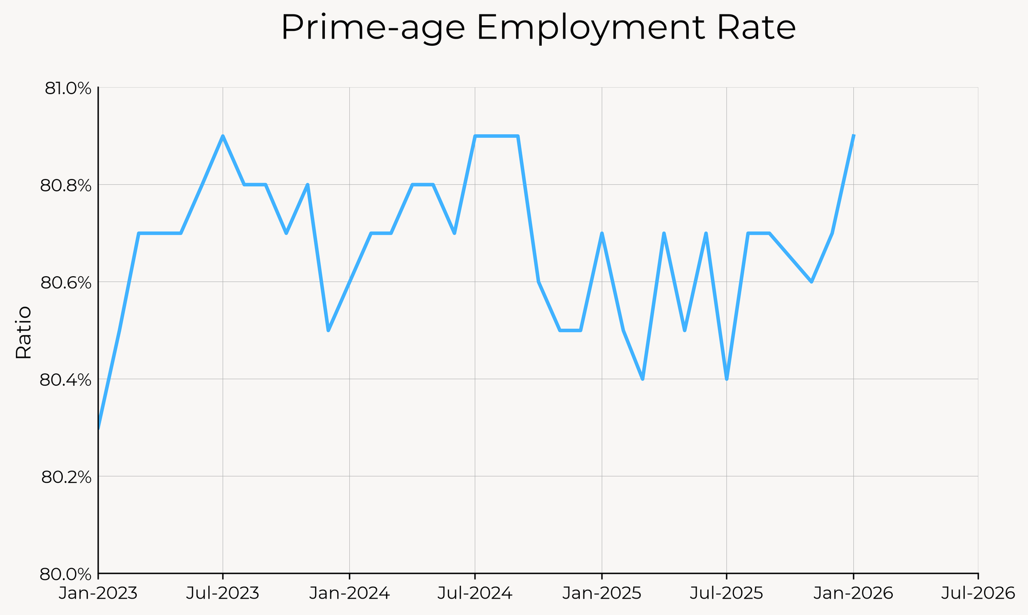 The labor market added 130,000 jobs in January 2026. The unemployment rate fell to 4.28% from 4.38% in and prime-age employment rose 0.2pp to match its cycle high at 80.9%. Quit, hire and layoff rates remained relatively stable.