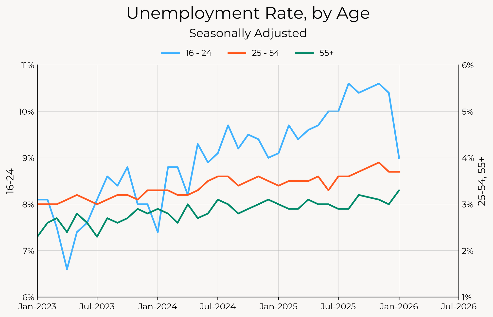 Two developments stand out in terms of accounting for the good news in the household survey. The first is a sharp decline in youth unemployment, which has been growing quickly over the past two years. The decline in youth unemployment this month basically erased the increases seen in all of 2025.