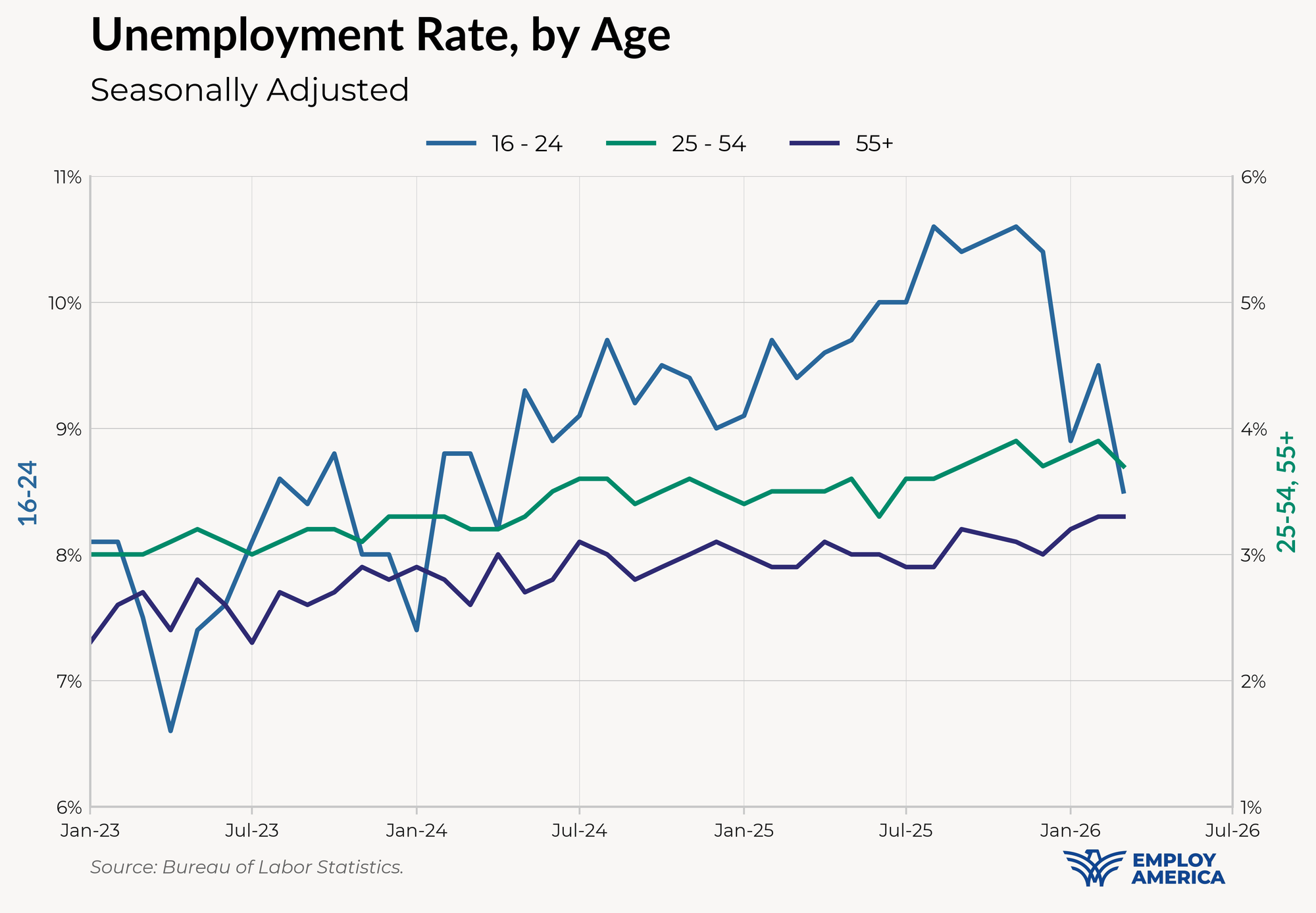 The decline in unemployment is mostly attributable to a decline in youth unemployment, particularly the 20-24 cohort. Youth unemployment, which peaked in August at 10.6%, has fallen to 8.5%. For reference, the prior level is similar to youth unemployment rate levels seen around 2015; the latter level is similar to around 2018.