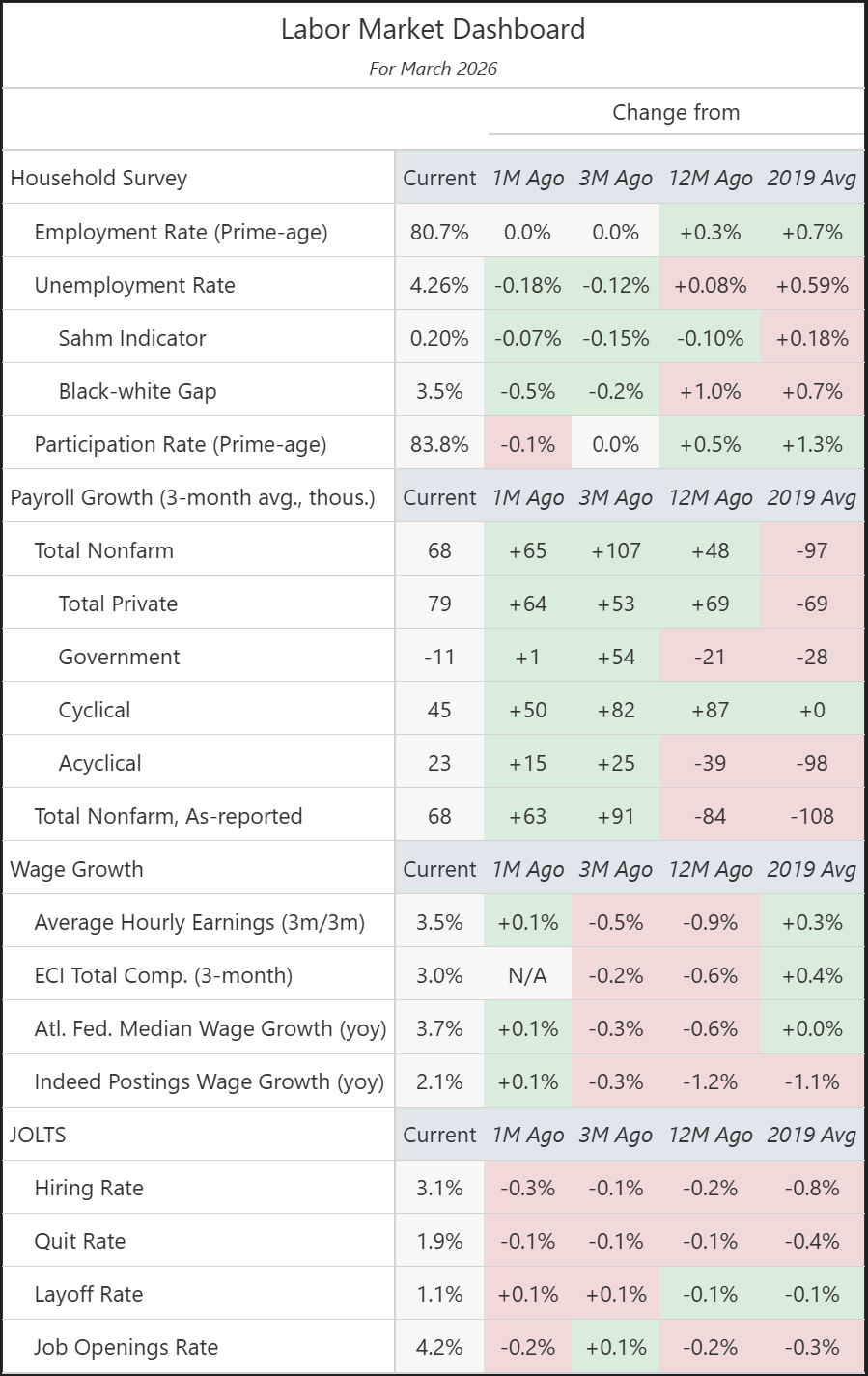 The labor market added 178,000 jobs in March 2026, with nearly-offsetting revisions to the previous two months (upwards for January by 34,000 and downwards for February by 41,000). The unemployment rate fell by 0.18pp to 4.26%, and prime-age employment remained at 80.7%. All signs of layoffs remained low, but the JOLTS hiring rate reached 3.1%, a level last seen in the depths of the COVID and GFC recessions.