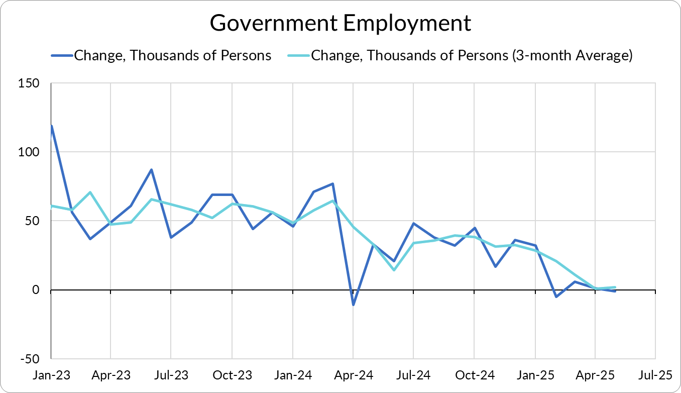 We’re really starting to see the impact of federal layoffs in payroll growth. The government is adding little to employment growth now, with outright declines in federal employment that are likely to continue due to the lags between federal layoffs with severance pay and payroll reporting.