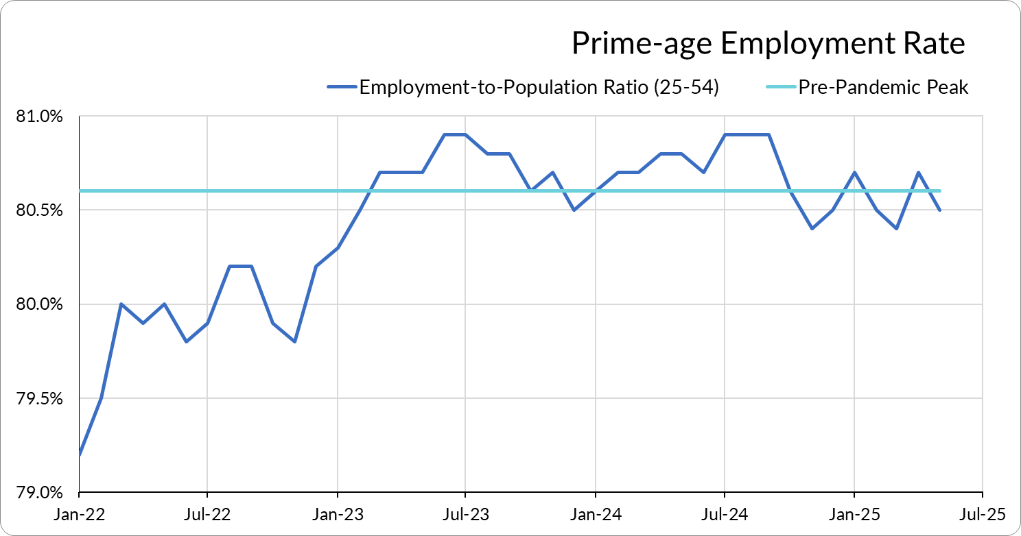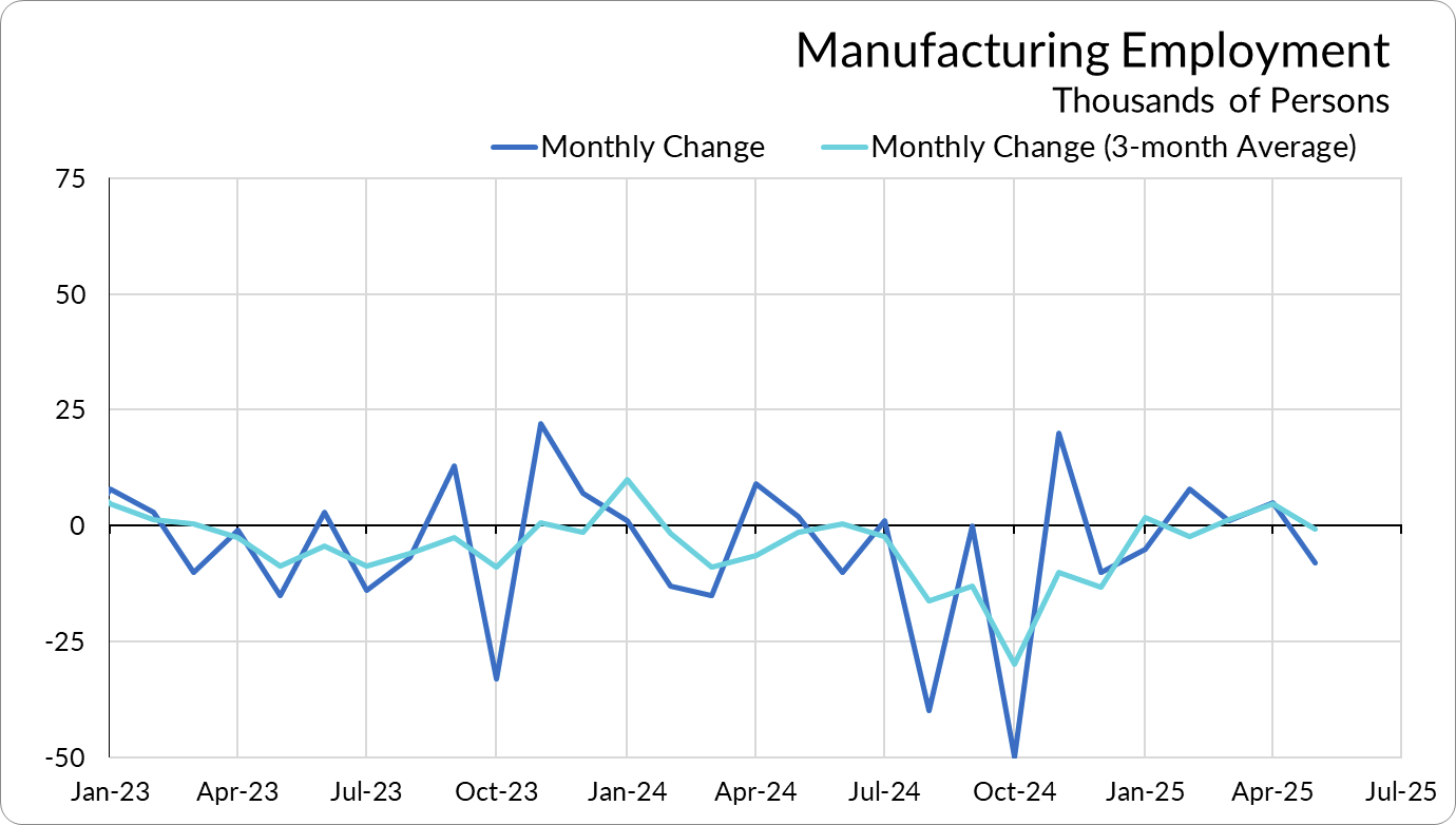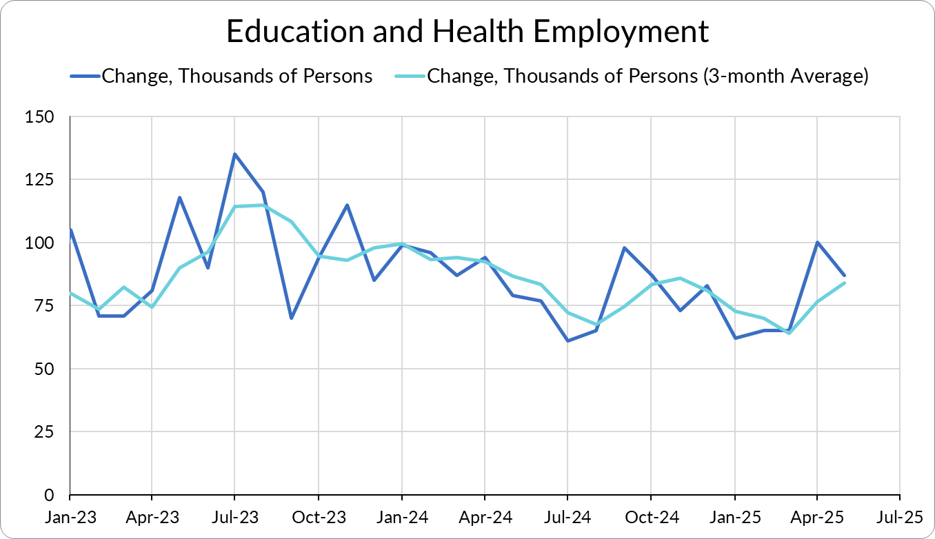 Going forward, the labor market appears vulnerable to some of the potential shocks and policy risks over the next few months. Manufacturing (as well as any sector that uses a lot of manufactured goods, such as vehicle services and even healthcare) will be challenged by lingering tariff policy and tariff uncertainty. Construction is likely to slow given the Fed’s desire to maintain high interest rates while tariff and budget policy gets sorted out. State and local government employment, which is currently adding to overall employment, will likely be challenged by Medicaid cuts straining state and local government budgets.