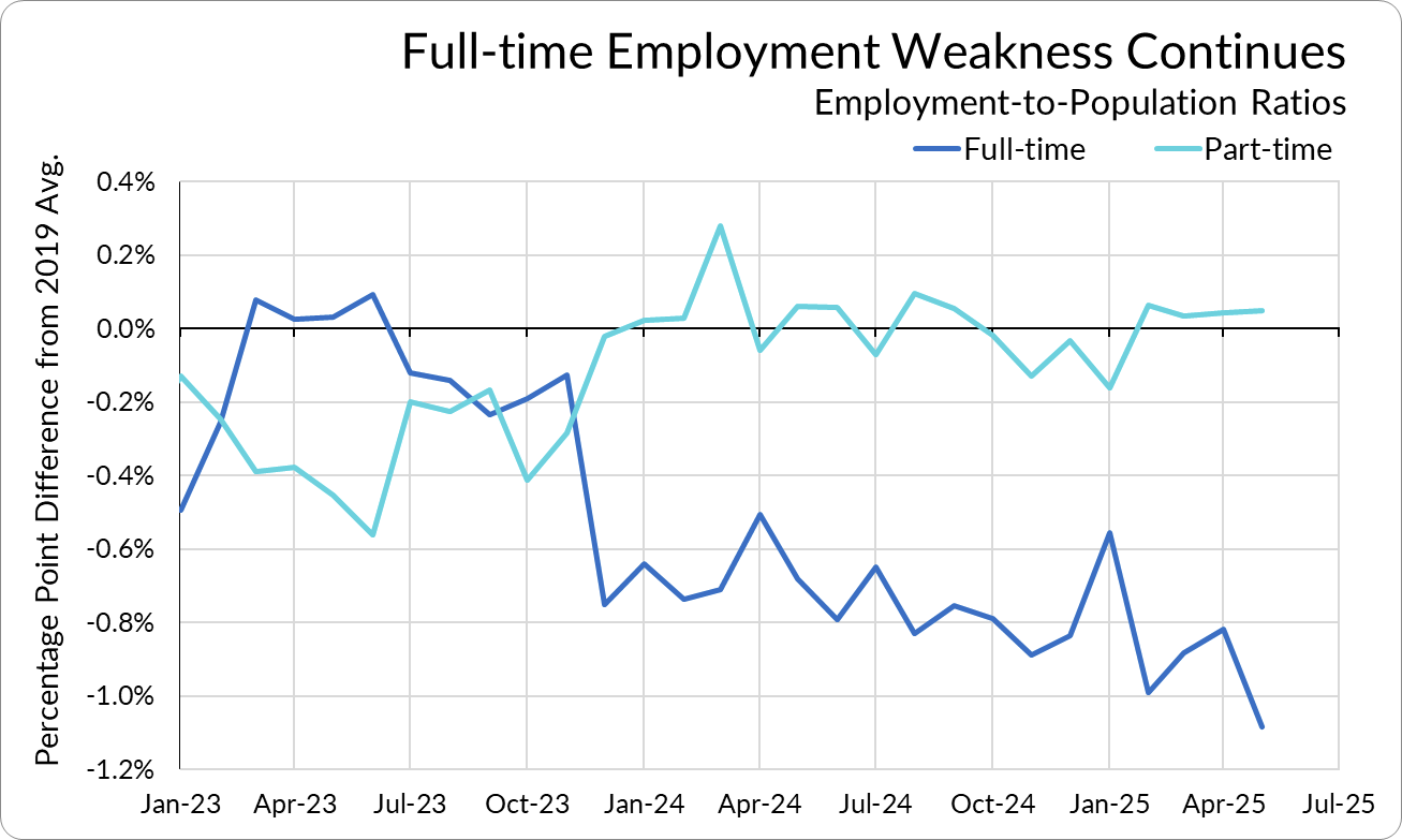 Full-time employment rates continue to decline, and are now a full percentage point lower than their 2019 average.