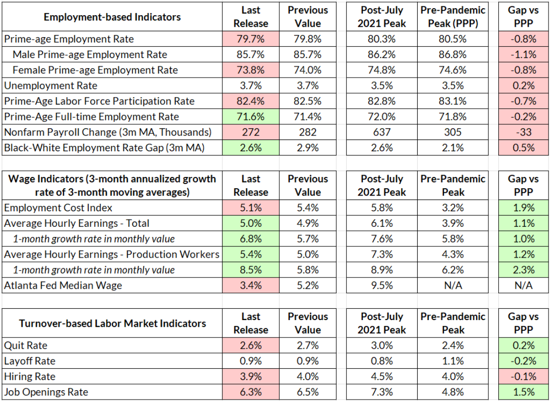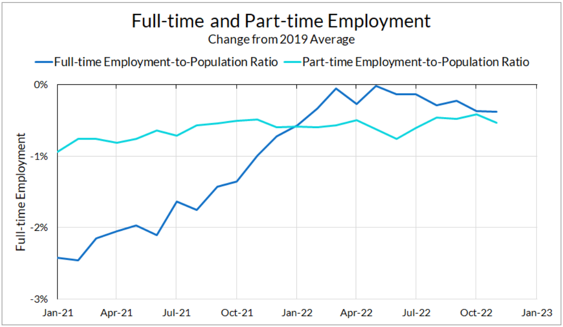One bright spot in the fall in employment in the household survey is that it is driven mainly by part-time employment. By the beginning of this year, full-time employment mostly recovered its losses from the pandemic but we’ve seen some backsliding on this measure since then. November’s data sees a welcome pause in this decline, and prime-age full-time employment is up slightly, from 71.4% to 71.6%.