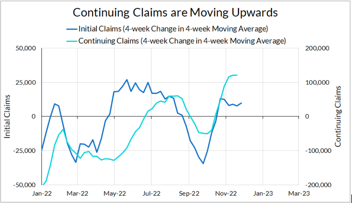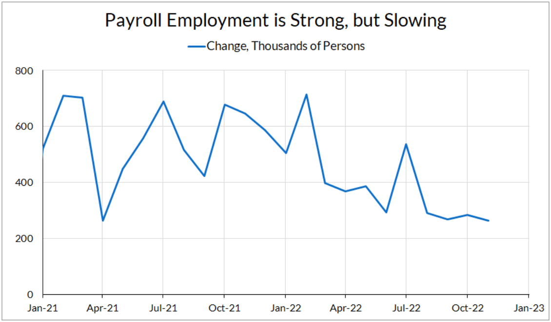 Overall, the labor market looks a lot like it’s normalizing from the pandemic and reopening shocks, and not necessarily in a way that leads to recession. The one outlier in this story is the high increase in average earnings in November, but we should be cognizant of the fact that this is one month’s worth of noisy data. However, we have yet to see the full effects of the Federal Reserve’s interest rate increases, and we should be on the lookout for signs of further deterioration in the coming months.
