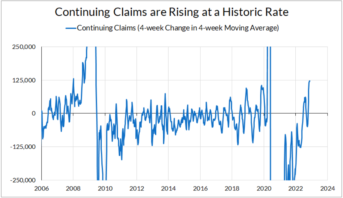 It’s possible that this fall in the hiring rate is to blame for the recent sharp increase in continuing unemployment insurance claims. In fact, continuing unemployment insurance claims are increasing at a rate not seen since the onset of the Great Recession and the pandemic recession. It’s possible that this is noise or being thrown around by seasonal adjustment, but it is a cause for concern.