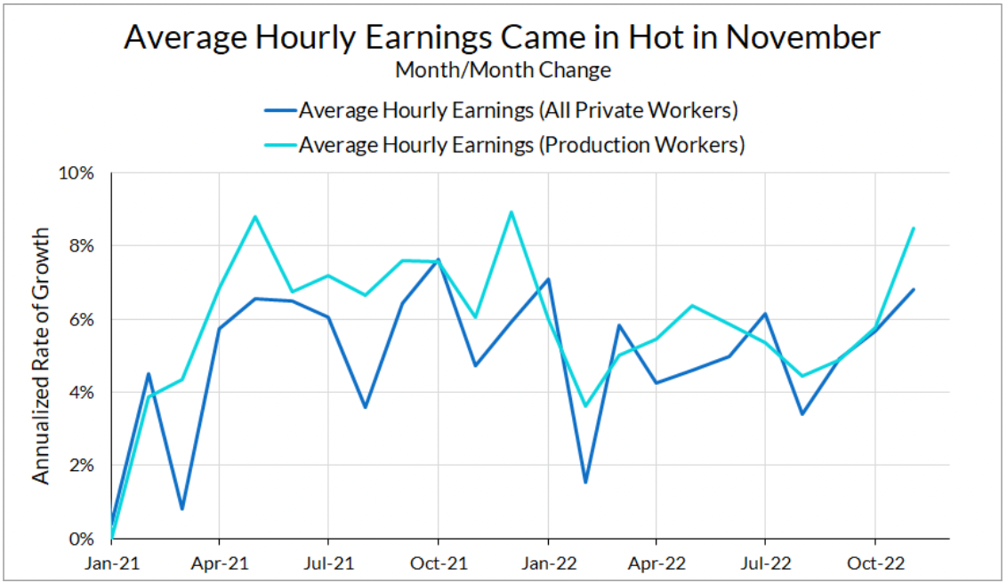 One standout in the November Employment Situation Report is the sharp increase in average hourly earnings. Average hourly earnings increased 6.8% for all private workers and 8.5% for production workers on an annualized basis. This increase is an interruption of the gradual slowing of wage growth we’ve seen over previous months.