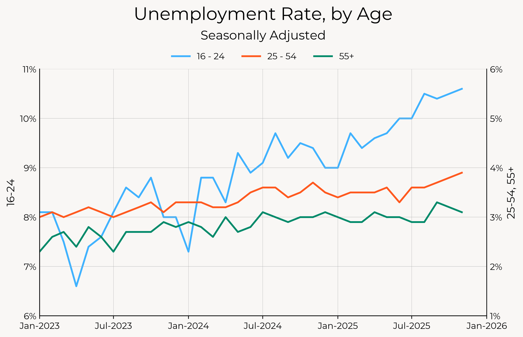 While overall prime-age employment rates are holding up, we’re seeing weakness on the fringes of the labor market. In particular, the unemployment rate for people aged 16 to 24 has increased rapidly, from 9% to 10.6%, since the beginning of this year. Unemployment rates for prime-age and older workers are up only slightly.