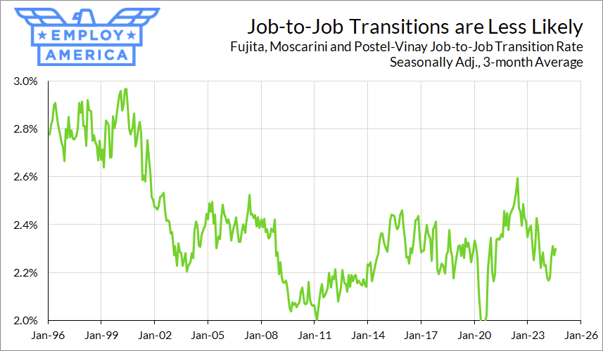 One way to try to get a handle on this phenomenon is to examine job-to-job transition rates and compare them to hiring rates from the un- or non-employed. The logic, proposed by Moscarini and Postel-Vinay (2023), is that low job-to-job transition rates are reflective of both overall labor demand as well as worker-job match quality (if workers are poorly matched, we should expect them to transition jobs more frequently). On the other hand, hiring rates of non-employed workers are more purely a signal of overall labor demand.
