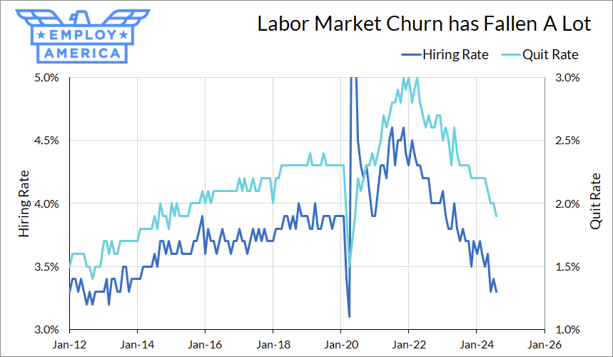 In other words, the “Great Stay” continues, where firms aren’t really looking to get rid of workers, but also aren’t in a hurry to hire new workers. One interpretation of the low hiring and quit rates is simply that labor demand is weak. But another hypothesis—one that I raised as a possibility earlier this year—is that workers are simply well-matched to jobs.
