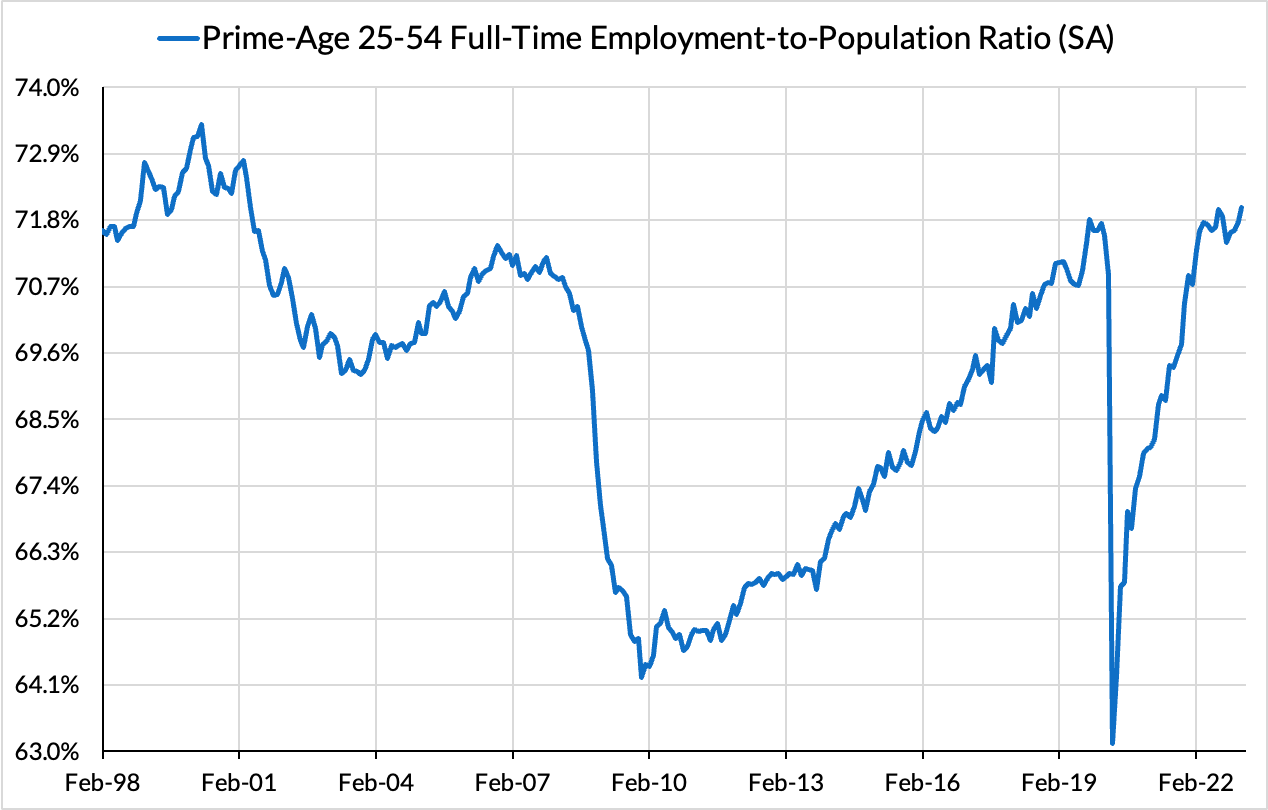 - The unemployment rate is more likely to fall from 3.6% (consensus) to 3.5% (baseline) than rise to 3.7%. The unrounded unemployment rate is 3.57% rate and total jobless claims continues to marginally fall. The household survey has also lagged the gains in the establishment survey (used for calculating nonfarm payrolls).