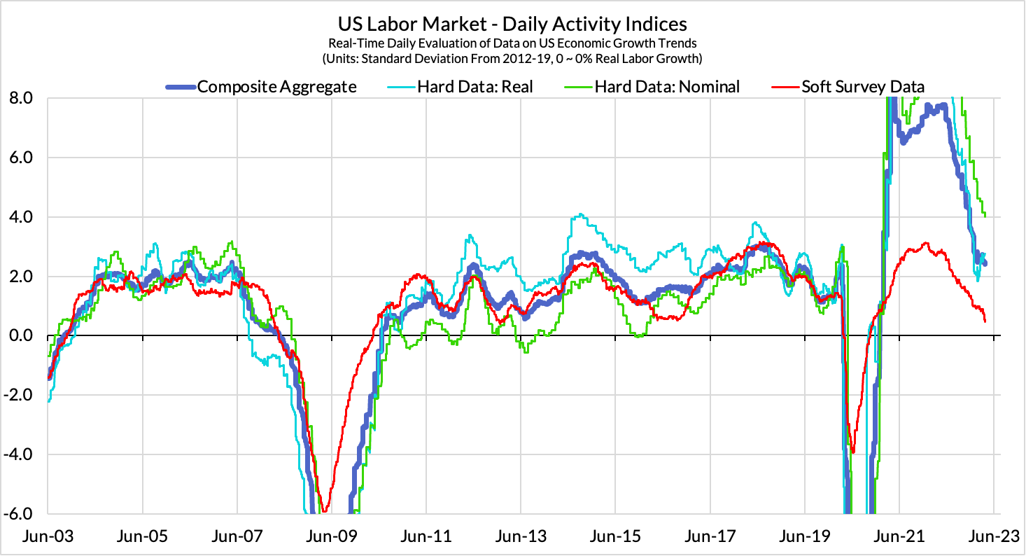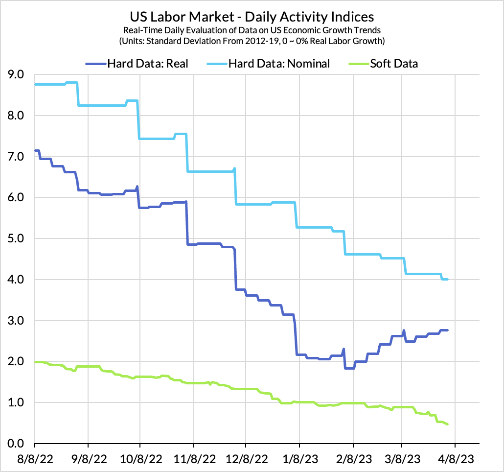 - Dovish: The biggest dovish game-changer from this release would be the prospect a monthly contraction in nonfarm payrolls, but that is still not consistent with all of the data we have now. Jobless claims have stayed solid and while survey data keeps showing a sharper slowdown, it also isn't signaling a contraction. If we did see soft wage growth in AHE, it would shade our ECI forecast marginally, and that might strengthen the case for the Fed to back off tightening (as it undermines their hyperbolic characterizations of labor market tightness).