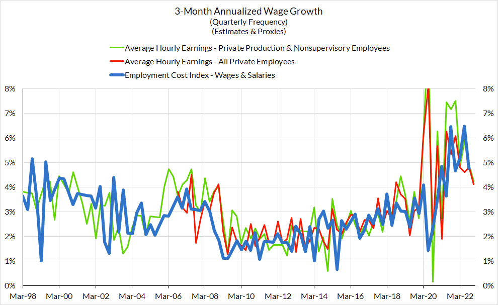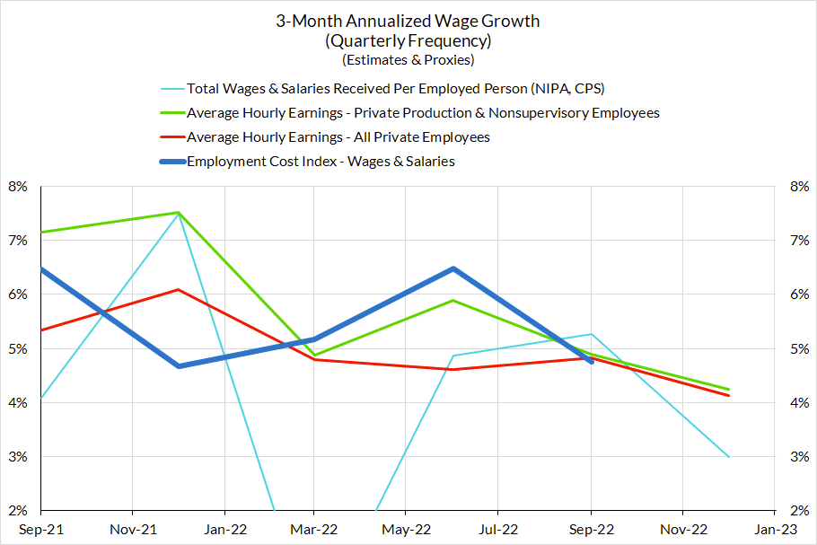To start with, the data is generally showing a slowing pattern in Q4. Dividing aggregate labor income by total employment or hours worked is vulnerable to composition biases. These measures of "average wages" are far from optimal when making business cycle judgments, but these composition biases should be less aggressive for 2022Q4 (in comparison to periods of recession and rapid recovery). Taken at face-value, annualized ECI growth would be on track to decelerate close to 4.2% annualized in 2022Q4.