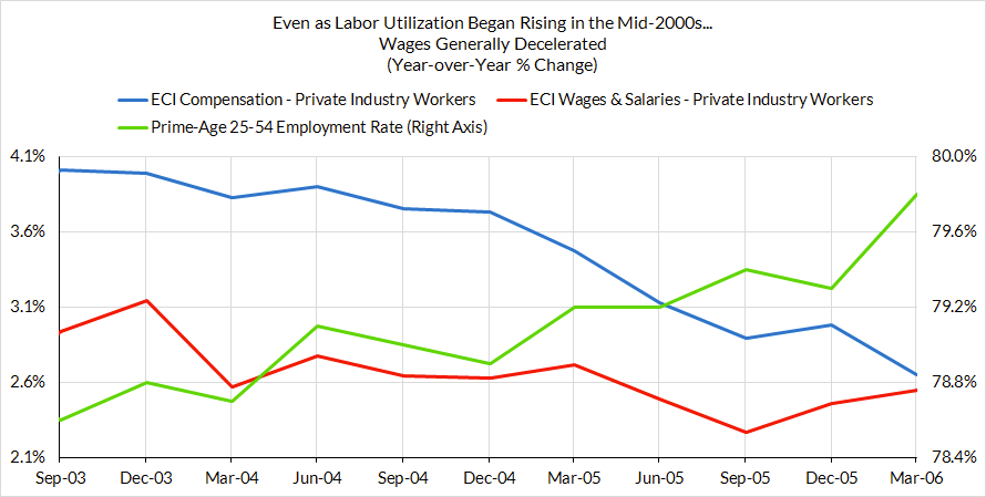 Look closely at the 2000-2002 period and you'll see that ECI growth was especially sticky in the face of underlying economic and labor market deceleration that was transpiring.