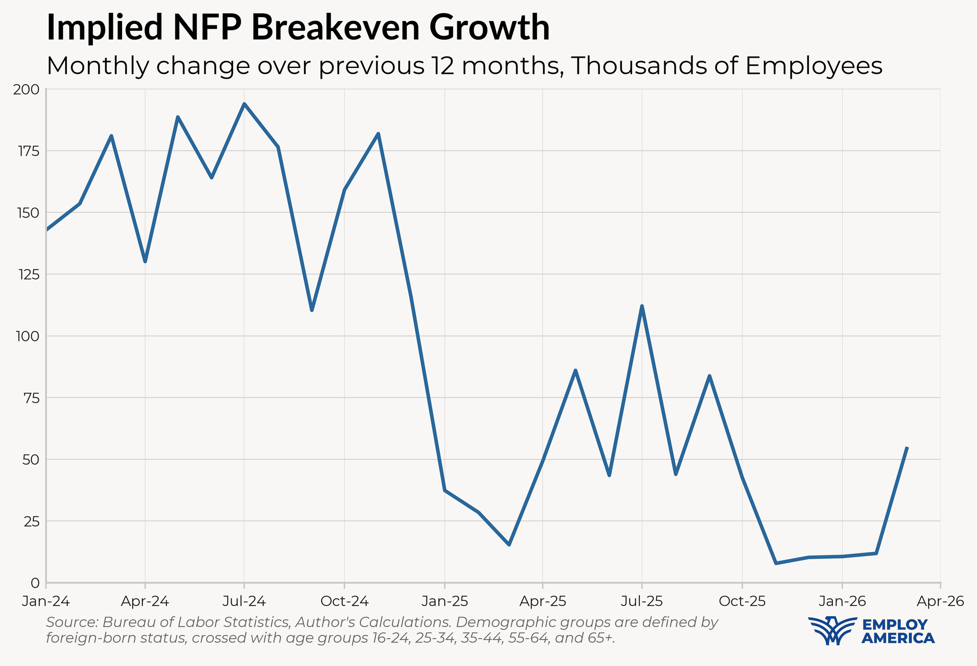 In this note, we take another approach to estimating (a version of) the breakeven NFP growth rate by taking Goolsbee’s remark above seriously. What rate of growth in NFP would be required to keep employment rates steady, based on the actual observed evolution of both NFP and employment in the CPS?