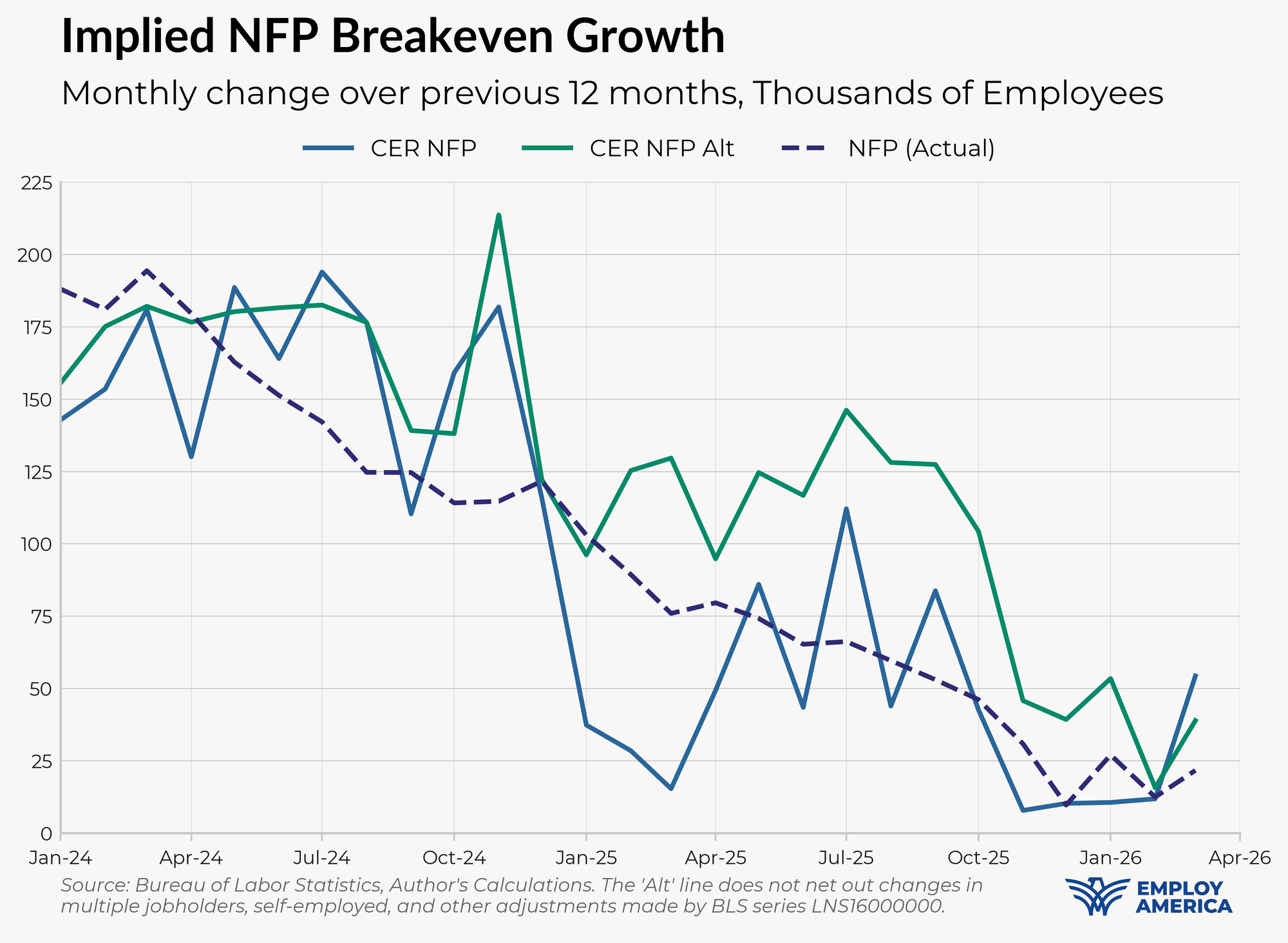 Below, we plot a version of CER-NFP that only nets out the group-level employment-population ratio growth rates from NFP growth, thus allowing changes in those definitional differences to affect the breakeven rate. One can think of this series as answering the question: “what level of NFP growth is necessary to maintain employment-population ratios by keeping up with both population growth and changes in trends in multiple job-holders, self-employed, etc.?”