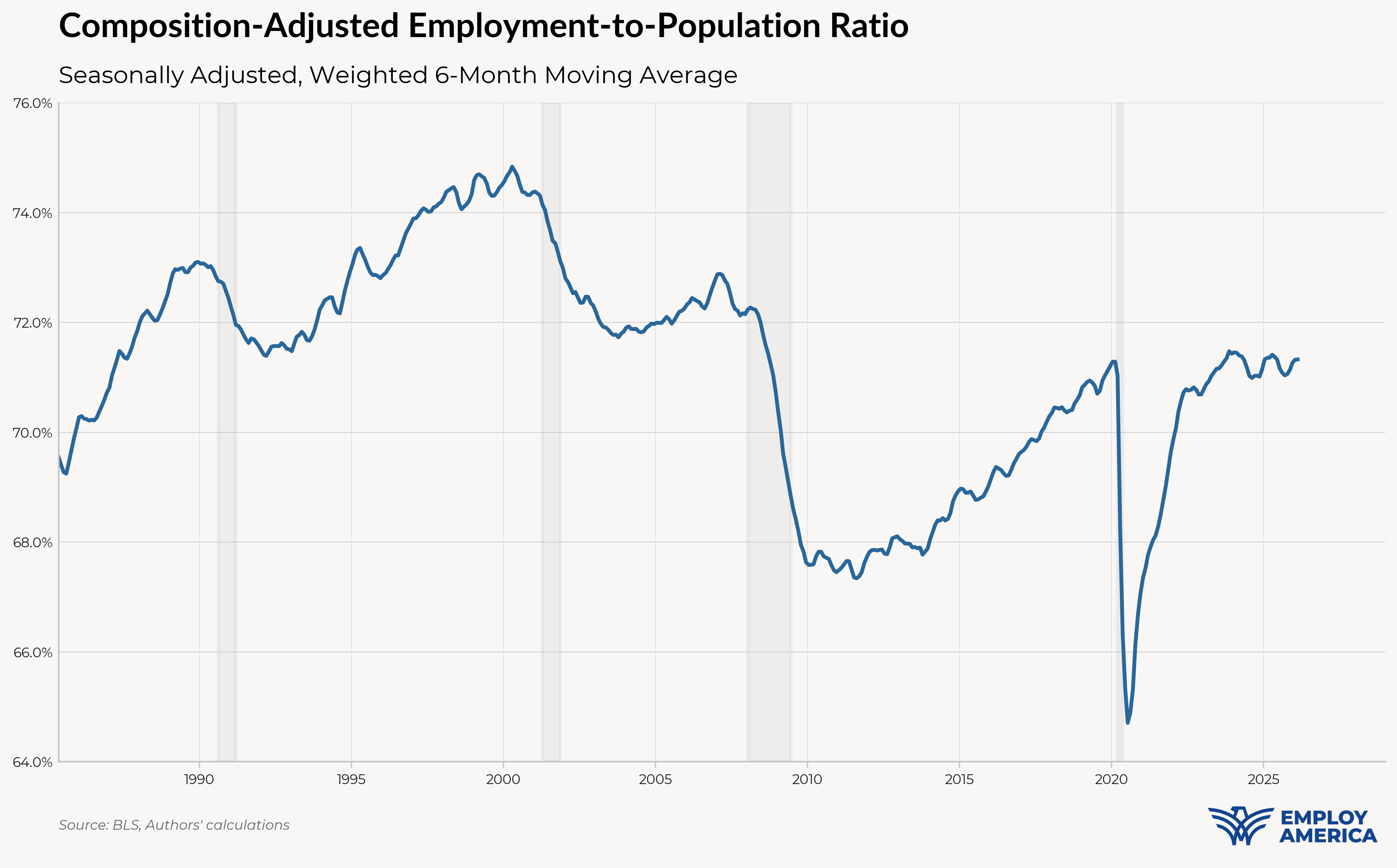 To provide the most robust measure of employment, we weighted the household survey’s employment to population ratio by 5-year age cohorts to match the current working age population. This allows us to match how the Fed is (or should be) tracking the household survey data.