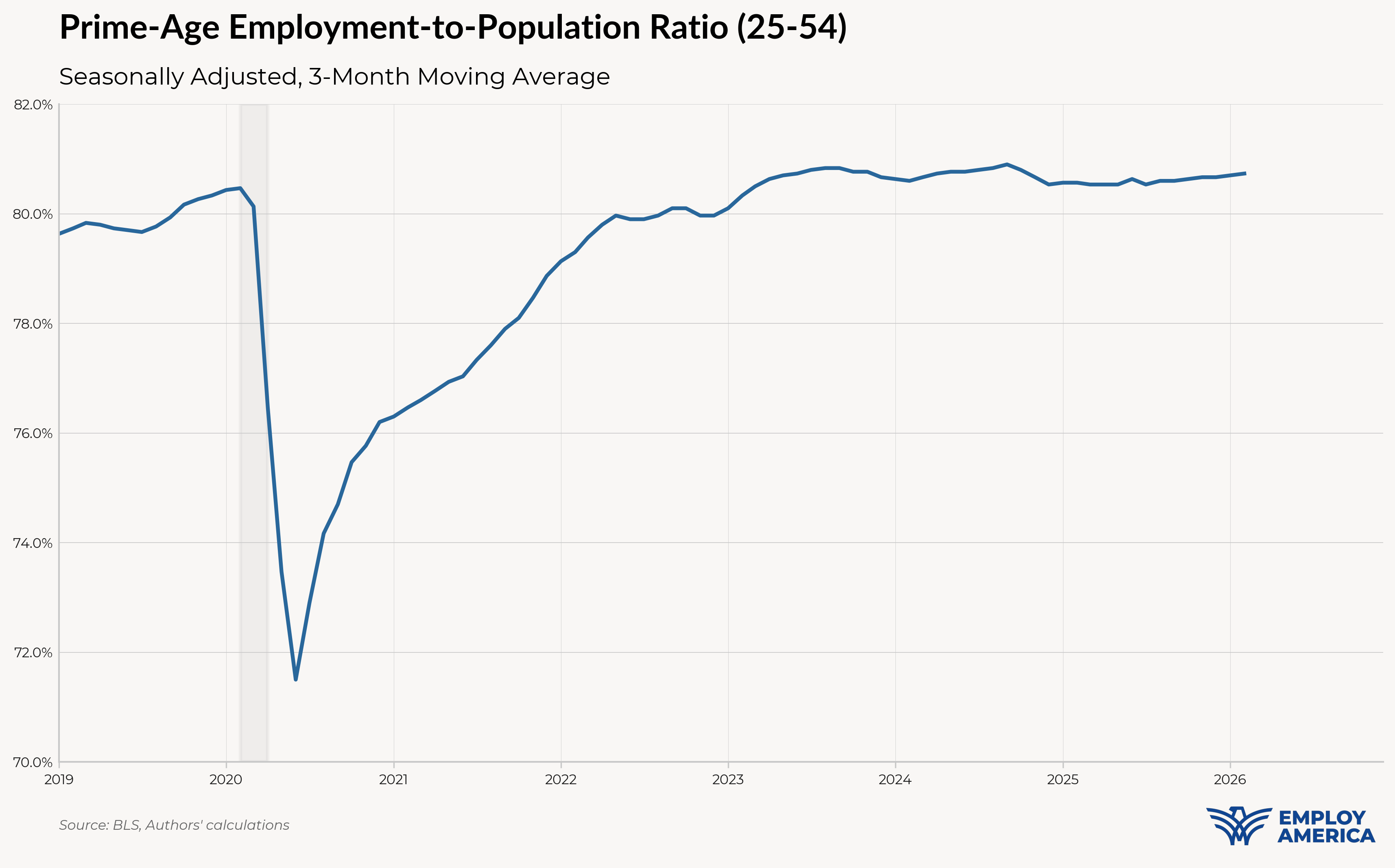 “prime-age individuals between ages 25 and 54 who are less affected by schooling and retirement decisions are participating in the labor market at higher rates than we’ve seen in decades. The employment-to-population ratio for prime-age workers is roughly at 2019 levels and well above average employment rates over the last 20 years. Simply put, with a large share of prime-age workers employed and earning paychecks, the labor market continues to support growth.”