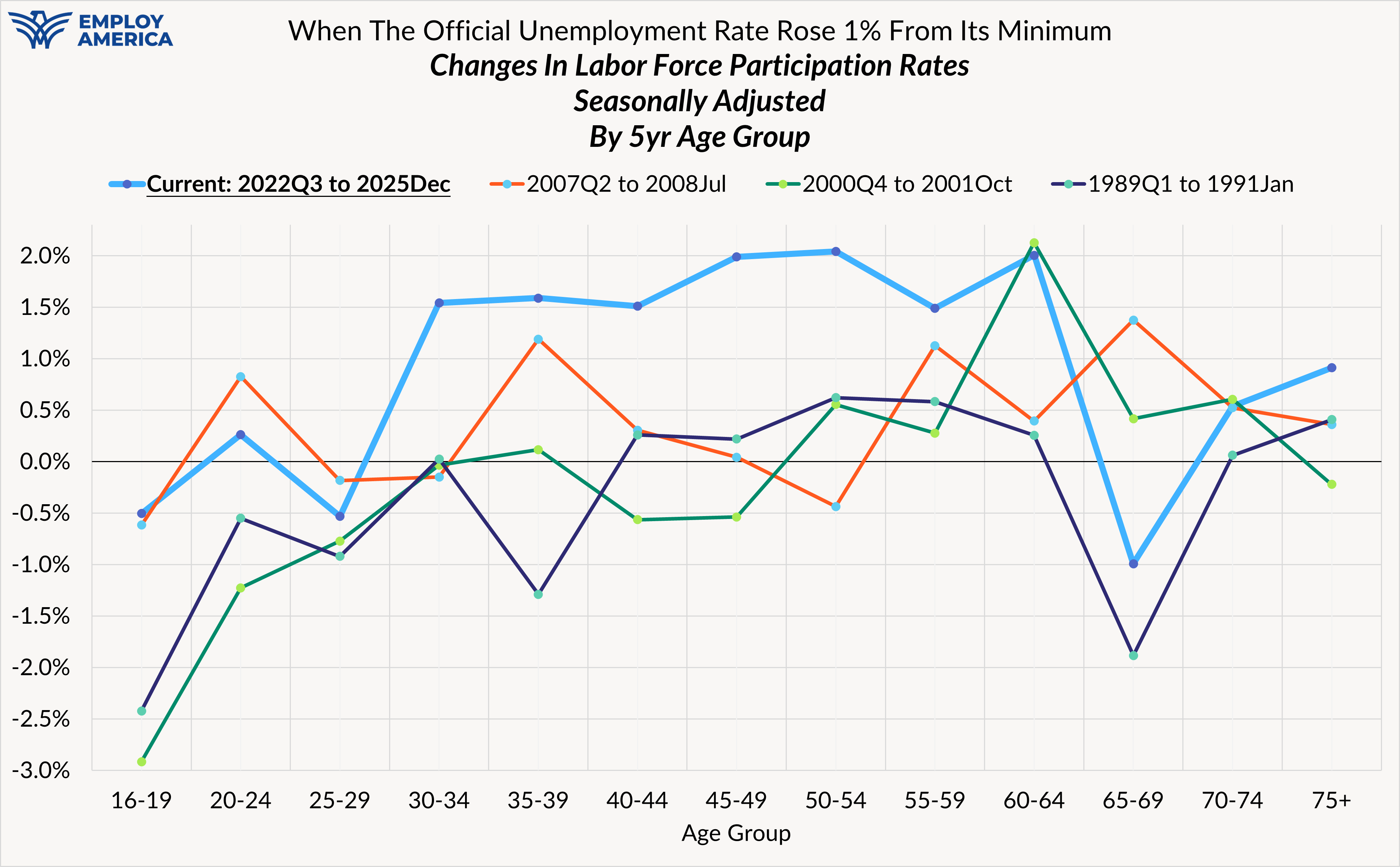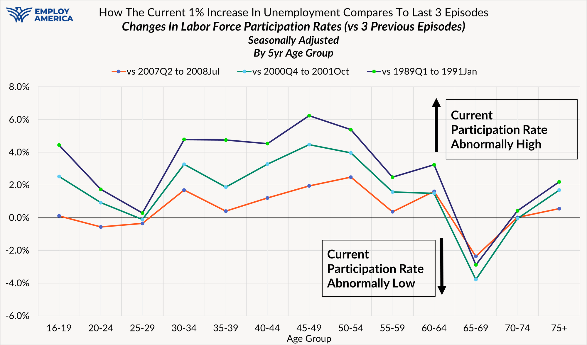 When comparing what labor force participation has done over this episode of rising unemployment, the outperformance is almost uniform across age groups, even if of varying magnitudes. You typically don't see an initial rise in unemployment alongside impressive labor force participation gains.