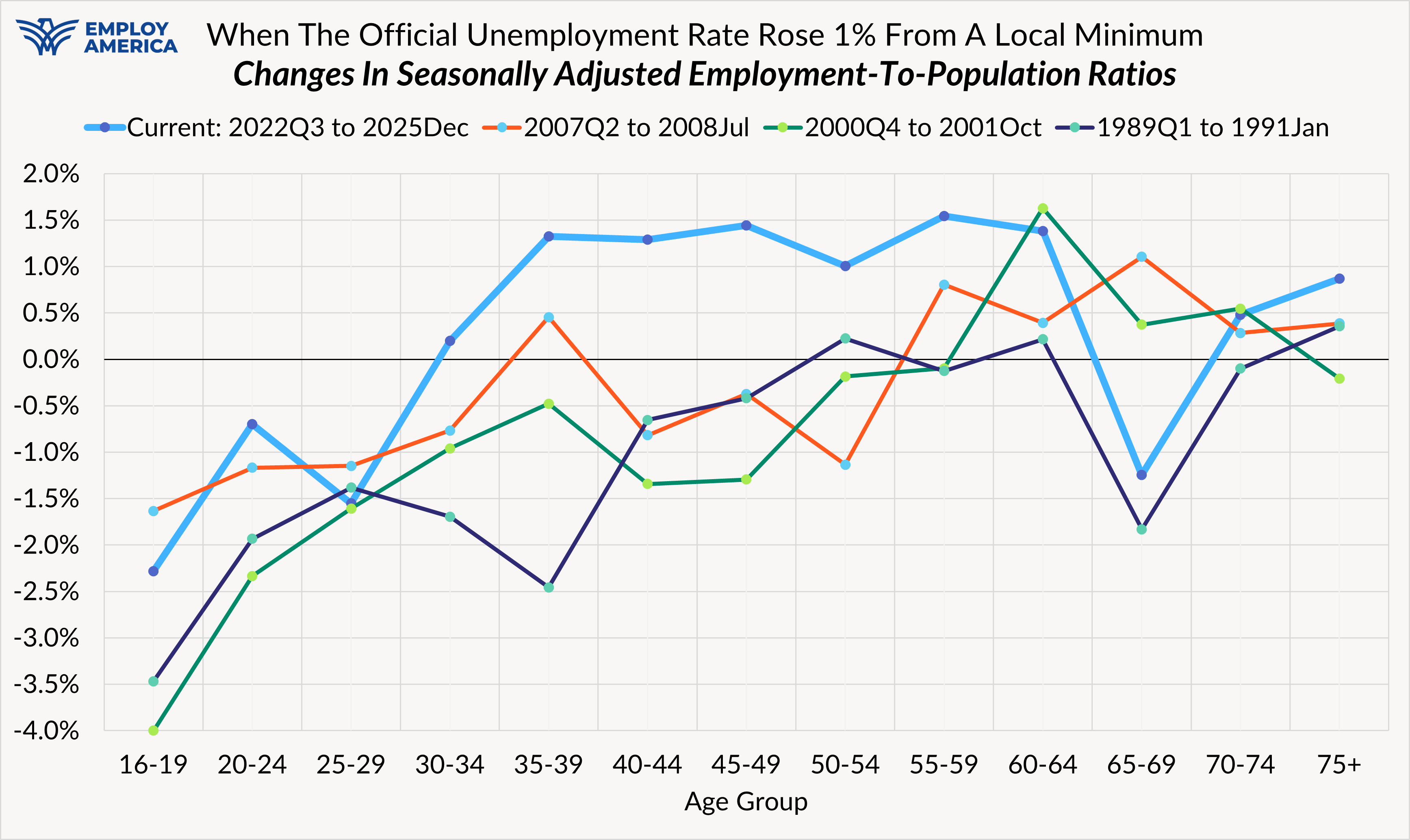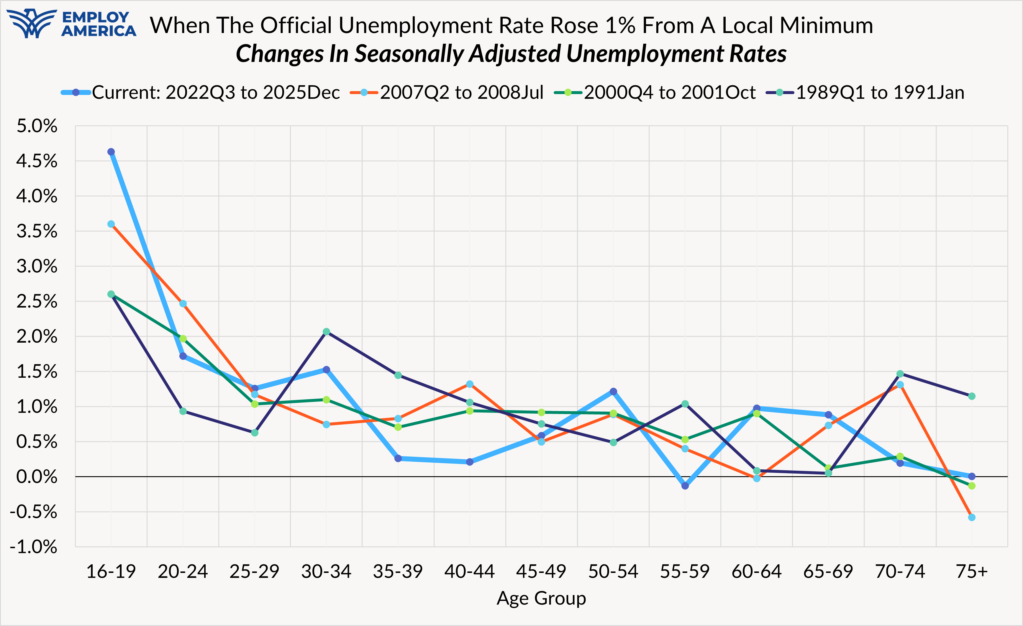 This time is proving to be different for the unemployment rate. Maybe it won't last. If we see more compelling evidence of recessionary forces emerging, our view of the labor market trajectory will have to grow more pessimistic. While we at Employ America are going to stay vigilant against threats to full employment, we think it's just as important to highlight good news where it emerges. We too were worried about the unemployment rate's initial rise in 204 and how that might interact with risks from restrictive policy. Since that time, interest rate policy has grown less restrictive and there is no value to crying wolf prematurely. The weakness in the labor market appears to be concentrated among 16-29 year olds, with much of it beginning prior to the onset of AI-related breakthroughs but continuing onward through 2025.