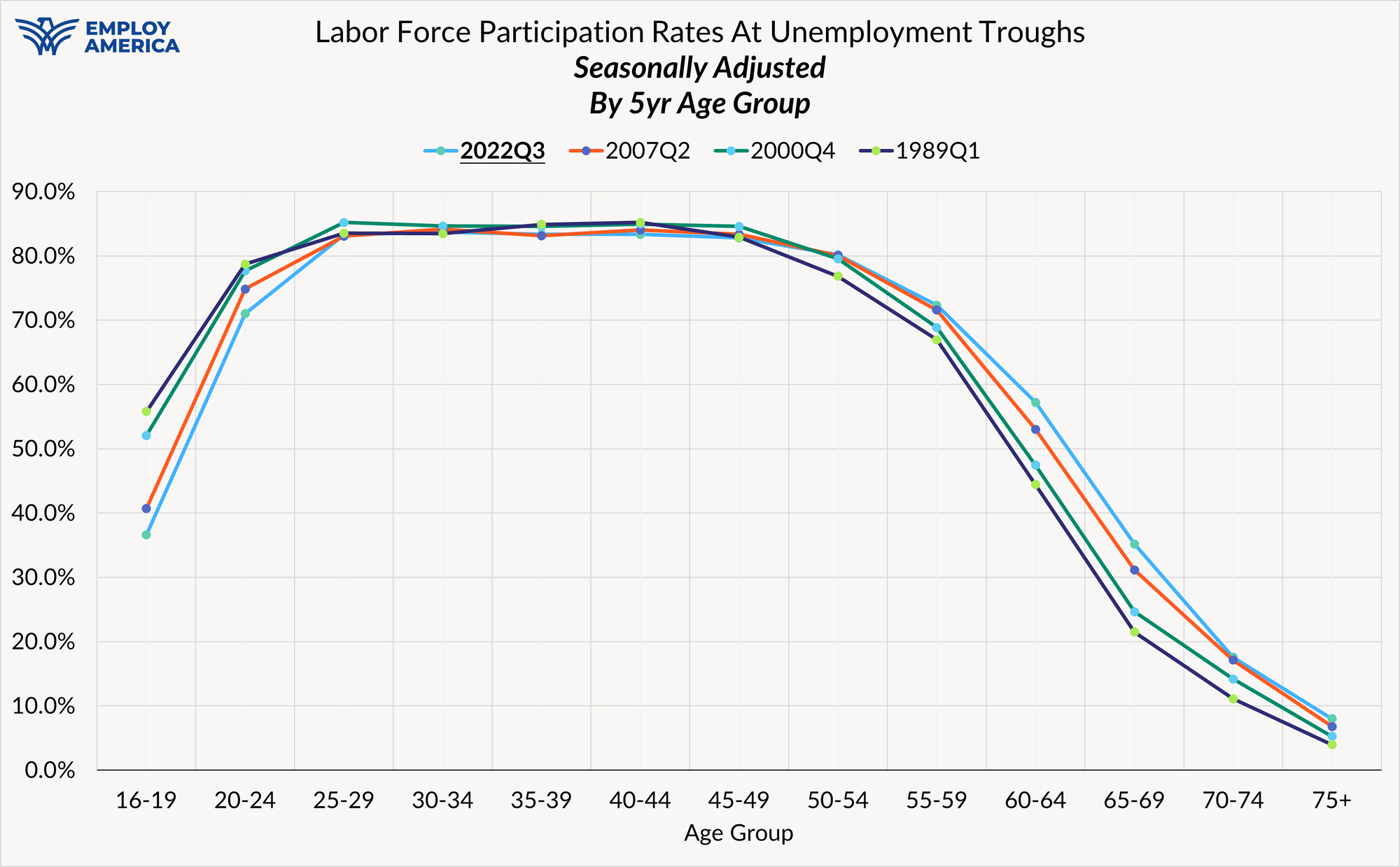 In the current episode, the unemployment rate has declined within a different age-group, 55-59 year olds, who also tend to participate a higher and growing rate than 16-19, 60-64 or 75+ year olds.