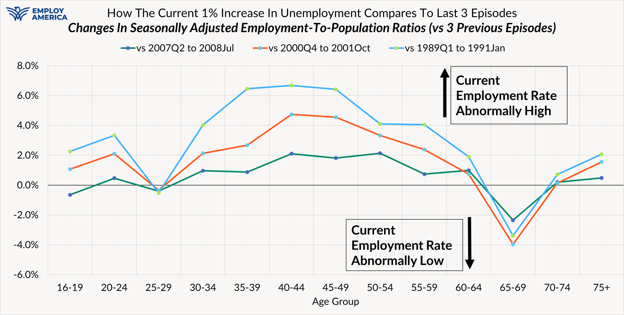 The coincidence between rising employment and rising unemployment is abnormal. When comparing employment-to-population ratio trajectories in the current episode to the prior three pre-pandemic episodes, the current outperformance is palpable across most age groups. Even for many age groups that have seen outsized increases in unemployment relative to past episodes, their employment-to-population ratios are still declining at a slower pace than their historical counterparts.